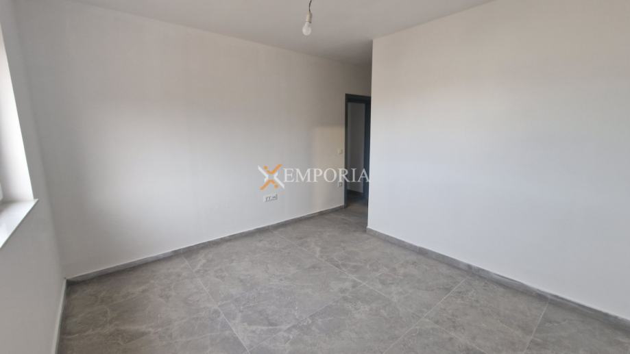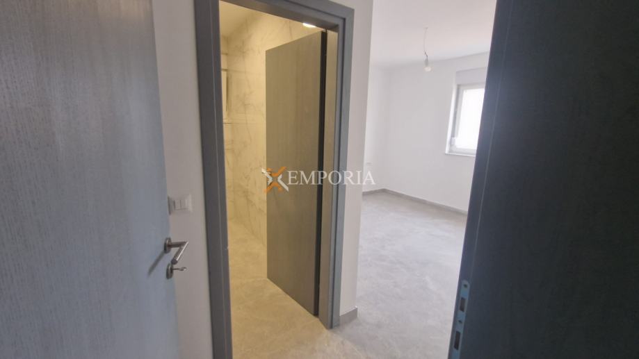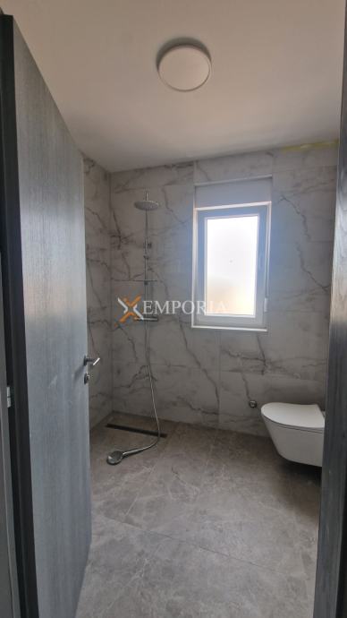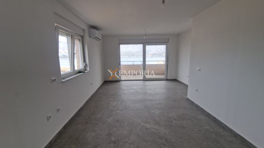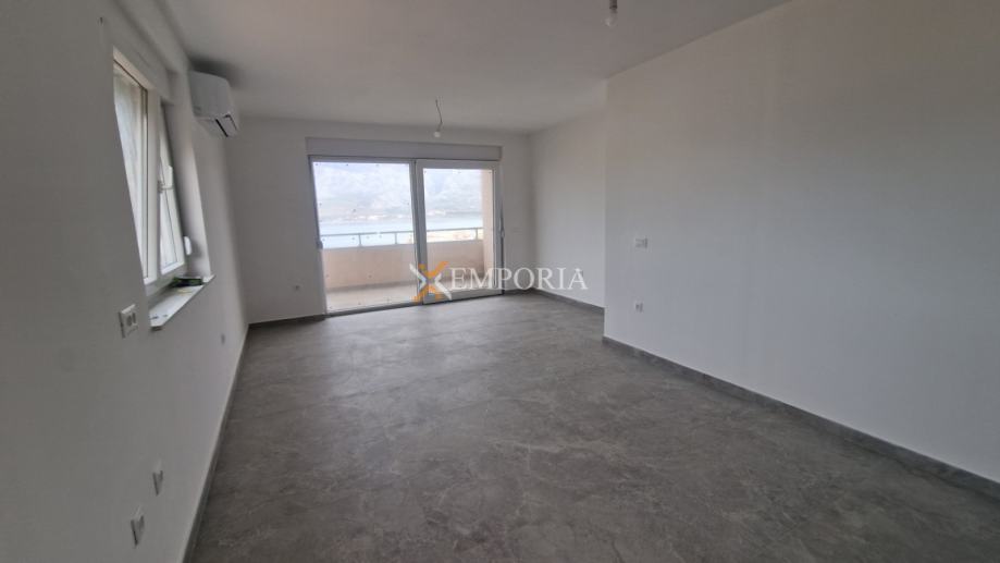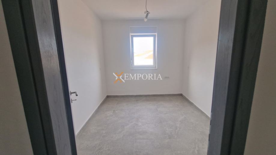Stan se nalazi na drugom katu zgrade te ima ukupnu neto površinu od 74,60 m² uključujući pripatke, dok neto korisna površina stambenog dijela iznosi 69,13 m².Raspored prostorija obuhvaća hodnik, dvije spavaće sobe (od kojih jedna ima vlastitu kupaonicu), dodatnu kupaonicu, kuhinju s blagovaonicom i dnevnim boravkom te natkrivenu terasu s pogledom na more.OpremaZgrada je građena od ciglenih termo blokova, s PVC stolarijom (troslojno staklo, rolete, komarnici) i stiropor fasadom debljine 8 do 10 cm. Podovi su obloženi pločicama, a ulazna vrata su protupožarna.