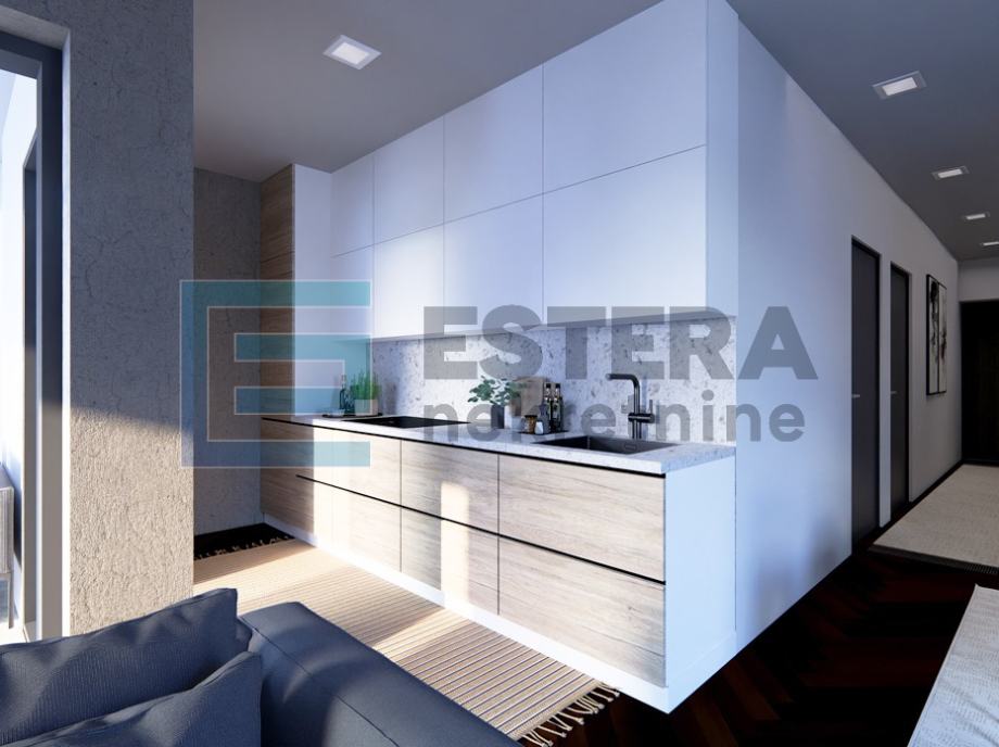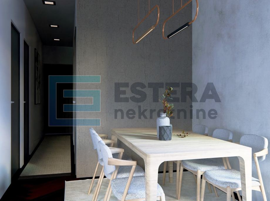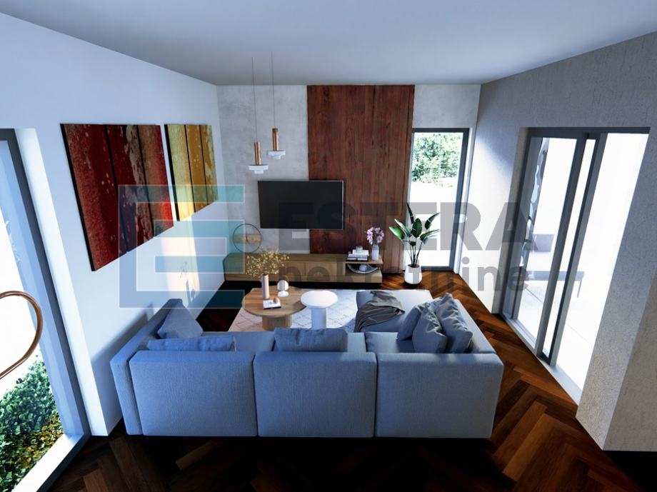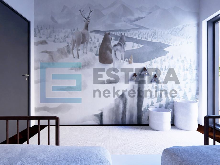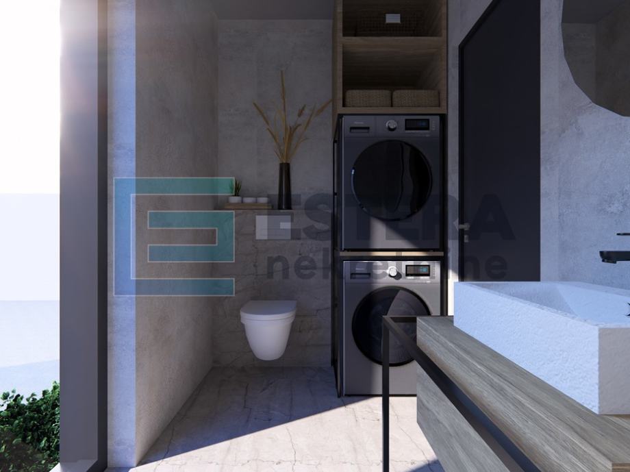 Dnevni boravak zamišljen je kao središte doma – moderan, ugodan i funkcionalan, s kaminom i velikim TV-om, idealan za opuštanje tijekom cijele godine. Kuhinja u L-izvedbi sadrži šank i sve potrebne uređaje, dok je blagovaonski dio predviđen za obiteljska i prijateljska druženja. Spavaće sobe opremljene su ugradbenim ormarima i bračnim krevetima, a elegantna kupaonica uključuje tuš kabinu te perilicu i sušilicu rublja diskretno postavljene u vertikalu. U cijelom stanu koriste se parketi i keramika prve klase.