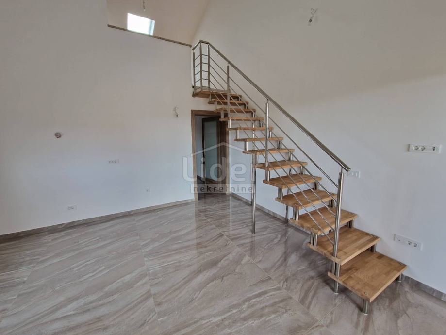 Prodaje se apartman u novogradnji u Banjolu, od 77 m2. Nalazi se na drugom katu zgrade koja je završena 2023 godine. Stan je dvoetažni. Na drugom katu se nalazi kuhinja, blagovaona i dnevni boravak te spavaća soba i kupaona, a u potkrovlju još jedna soba i kupaona. Apartmanu pripadaju 2 parkirna mjesta.