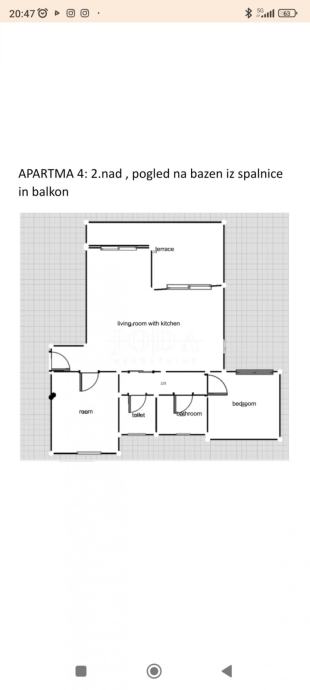 stan na prvom katu, koji se sastoji od kuhinje i dnevnog boravka, degažmana, dvije sobe, kupaonice, wc-a i nenatkrivene terase