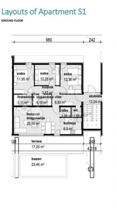 Apartman se nalazi na prizemlju zgrade od 3 kata. Ima 3 spavaće sobe, 2 kupaonice i 1 WC, izbu, dnevni boravak sa blagovaonom i kuhinjom, terasu od 52,22 m2 na kojoj je bazen od 23,46 m2.