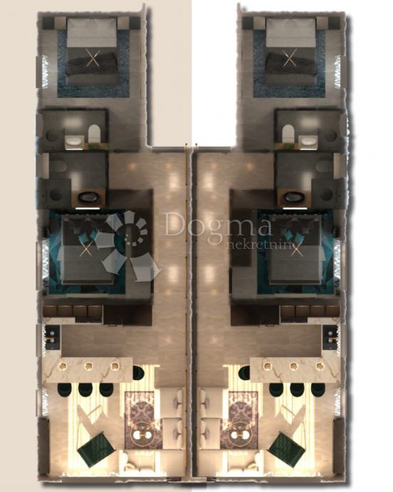 Sastoji se od: ulaznog dijela, dvije spavaće sobe, dvije kupaonice te prostranog dnevnog,
