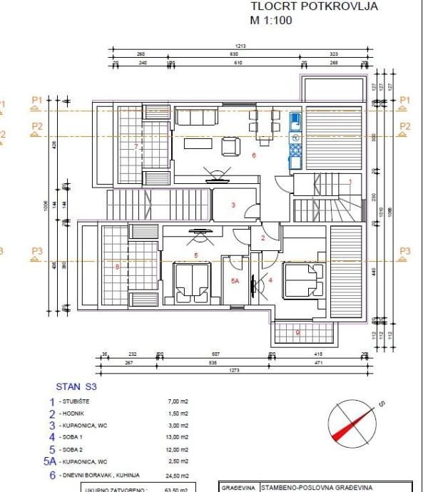 Apartman S3 ukupne veličine 69.50m2 nalazi se na 2.KATU zgrade i sastoji se od STAMBENOG DIJELA površine 63.50m2 (hodnik, dvije spavaće sobe, dvije kupaonice, dnevni boravak sa kuhinjom i blagovaonicom), TE VANJSKOG DIJELA tri terase sveukupne veličine – 16m2 i dva parkirna mjesta – 25m2.