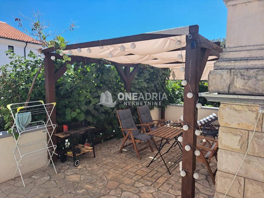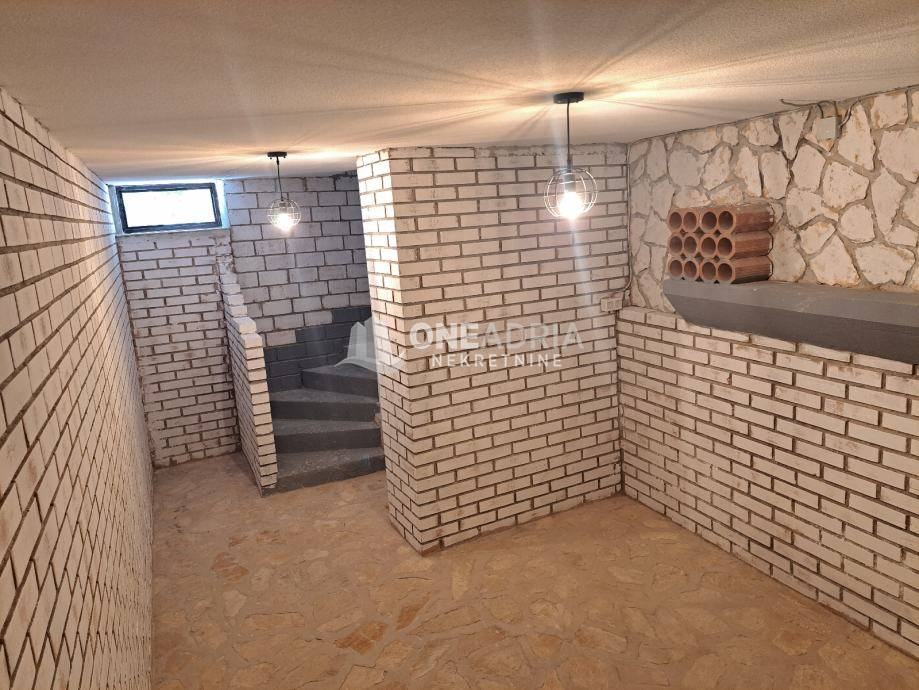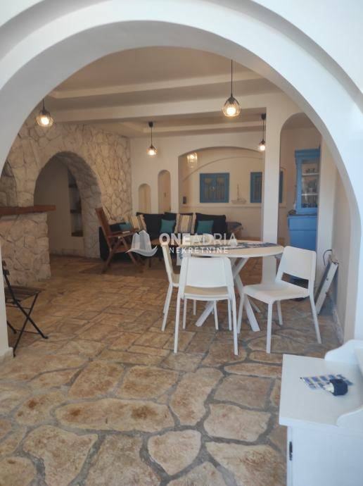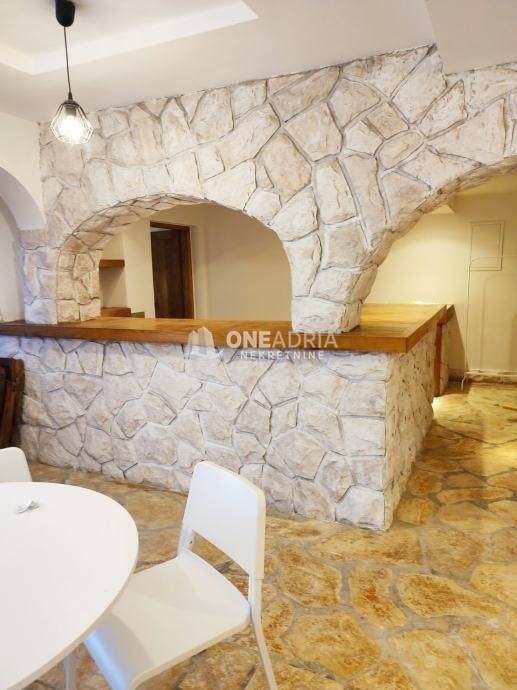 Do stana vode kamene stepenice od 10m2, terasa je kamena preuređena od 30tak m2, konoba se sastoji od velikog masivnog drveno kamenog šanka u obliku slova L iza kojega se nalazi kuhinja, dok se ispred njega nalazi prostor koji čini blagovaonu i dnevni boravak!!