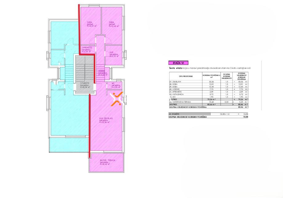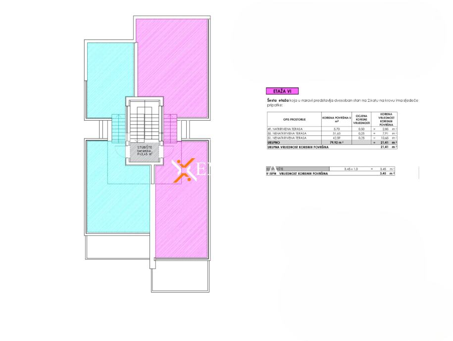 Neto korisna površina zatvorenog dijela apartmana iznosi 80,46 m², dok ukupna neto površina s pripacima doseže 101,87 m². Stan uključuje i dvije nenatkrivene površine na krovu povezane unutarnjim stepenicama te natkriveni dio terase.