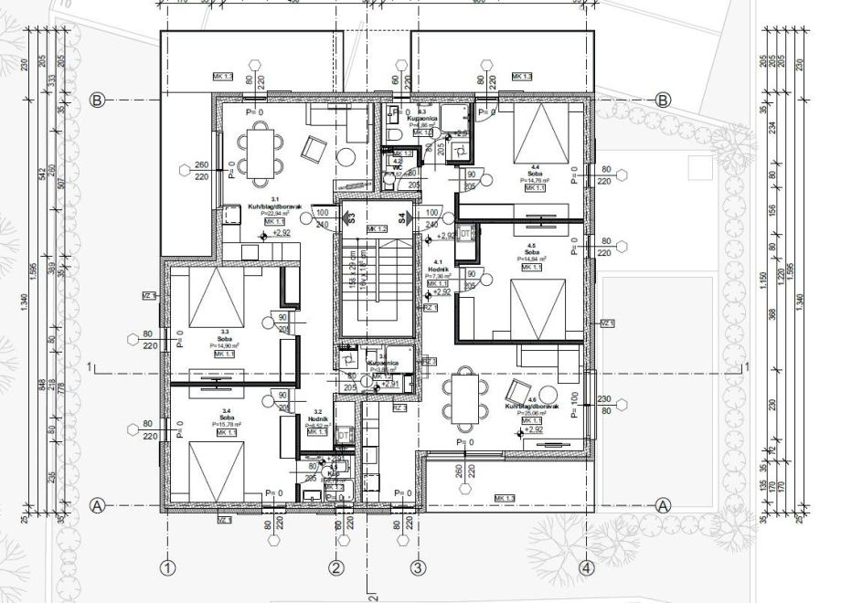 S3- ukupne veličine 84,60m2 nalazi se 1.katu zgrade i sastoji se od STAMBENOG DIJELA površine 68,78m2 (hodnik, dvije spavaće sobe, kupaonica 1, kupaonica 2, dnevni boravak, kuhinja i blagovaonica), TE VANJSKOG DIJELA dva parking mjesta – 25m2 i terase 21.61m2.