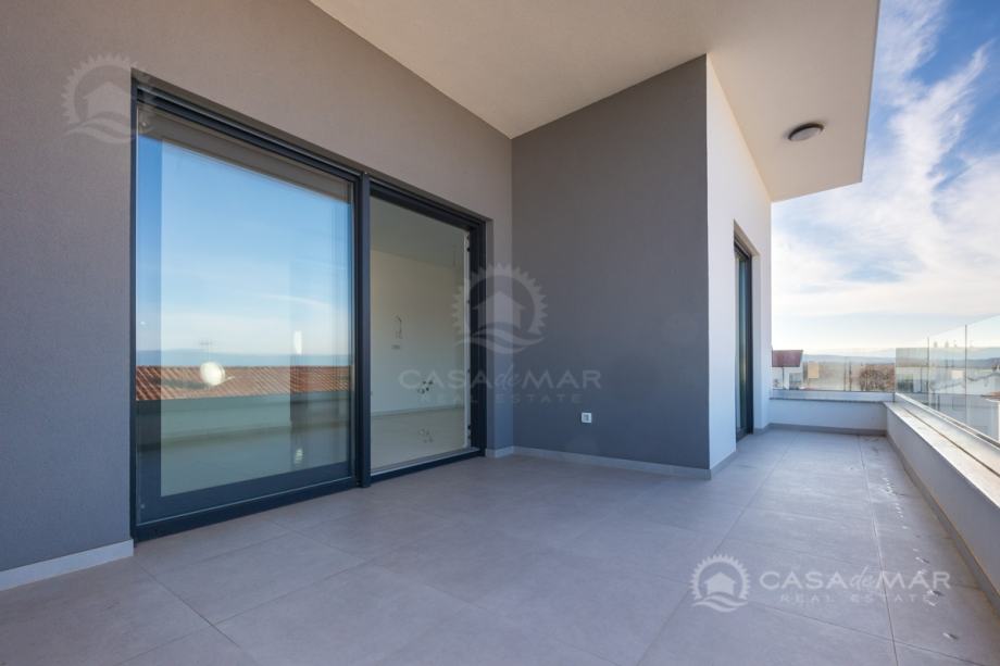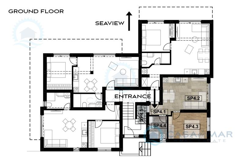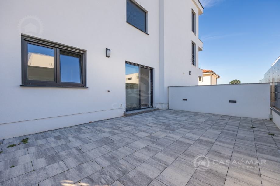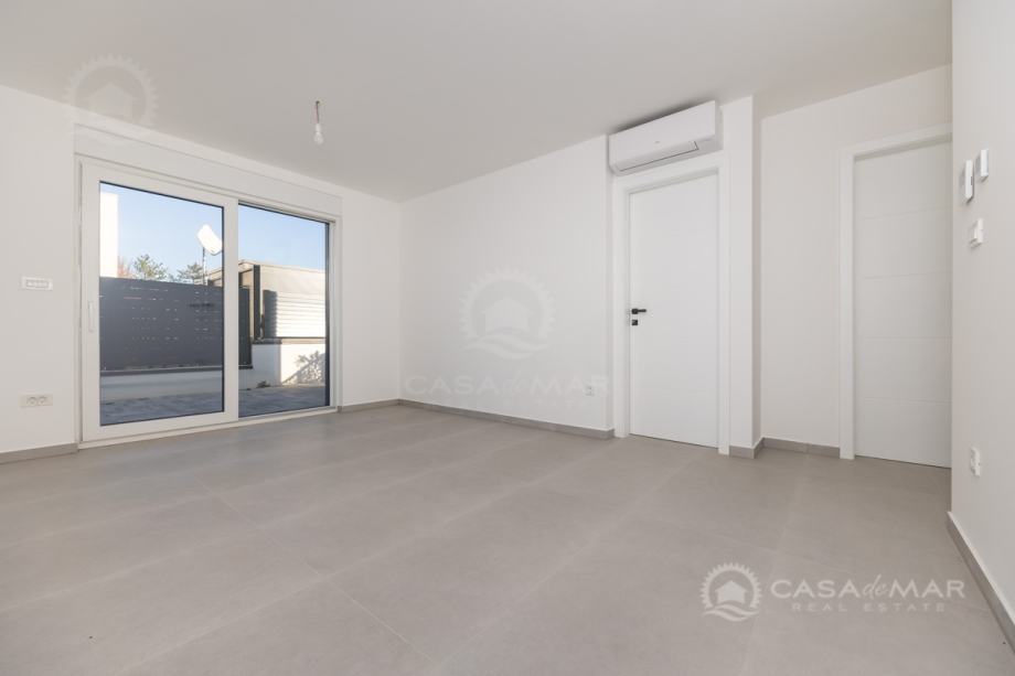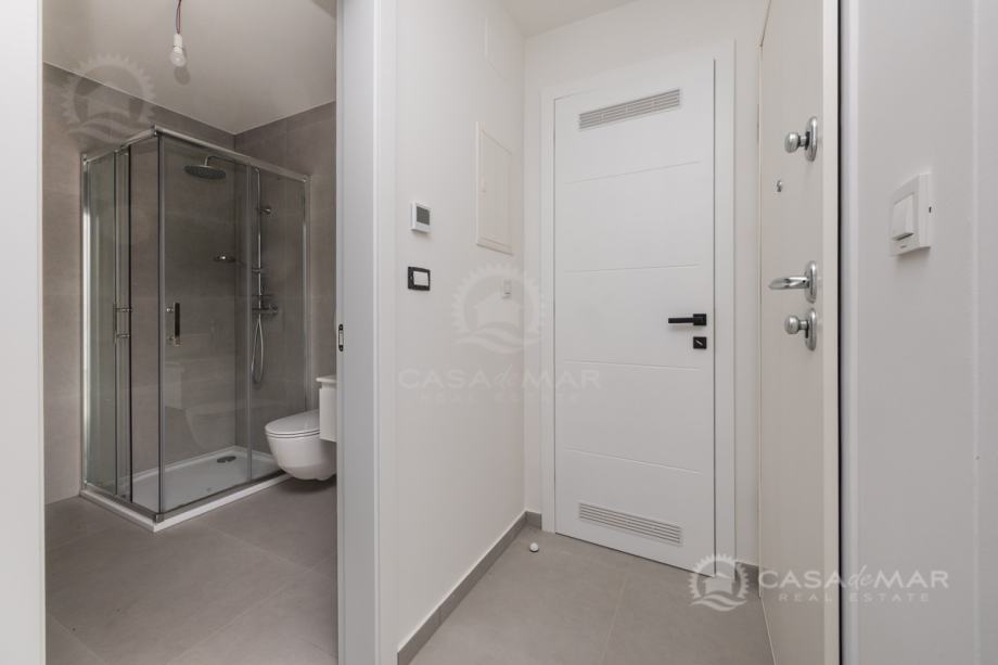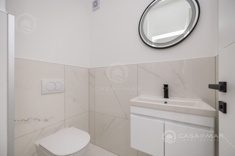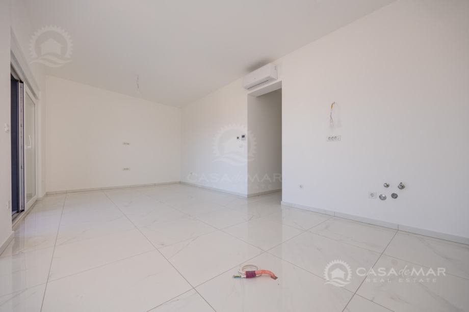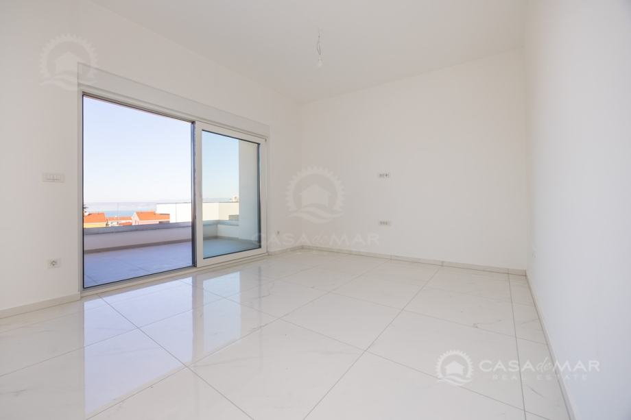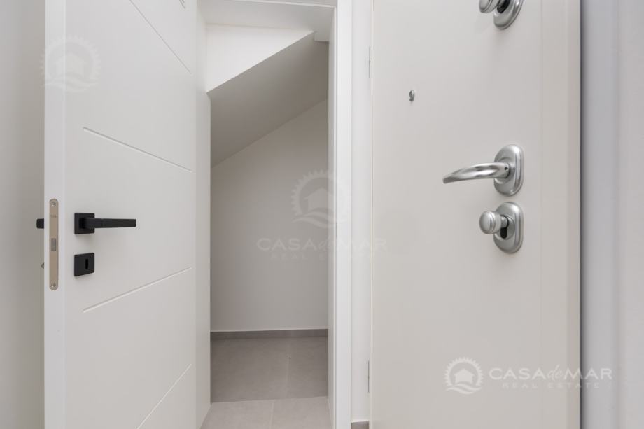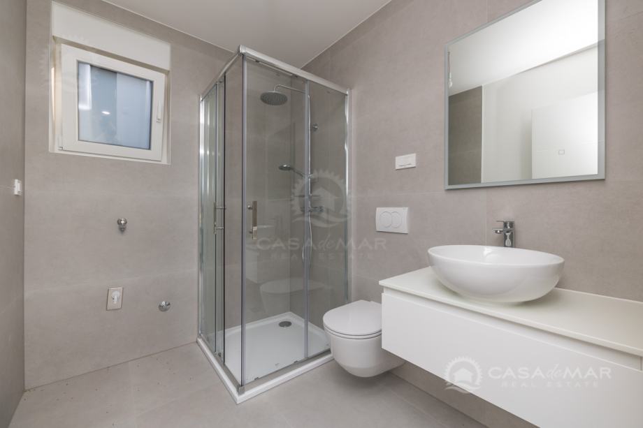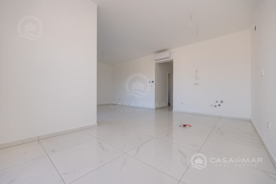 Glavni apartman ukupne površine 78 m² nalazi se na drugom katu stambene zgrade. Sastoji se od ulaznog hodnika, prostranog dnevnog boravka povezanog s kuhinjom i blagovaonicom, dvije spavaće sobe, kupaonice i dodatnog toaleta. Iz dnevnog boravka i blagovaonice izlazi se na natkrivenu terasu s koje se pruža otvoreni pogled na more, što dodatno naglašava vrijednost i atraktivnost nekretnine.