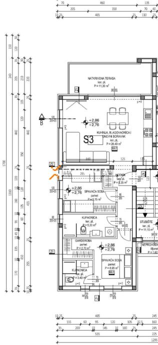 Die Wohnung besteht aus einem Flur, zwei Schlafzimmern – eines davon mit eigenem Bad und Ankleide – einem weiteren Badezimmer sowie einer Küche mit Ess- und Wohnzimmer, von dem aus man auf eine überdachte Terrasse gelangt. Die Netto-Wohnfläche beträgt 66,60 m², die gesamte Nettofläche mit Nebenflächen beträgt 69,35 m². Ein Parkplatz ist im Preis inbegriffen.AusstattungDie Badezimmer verfügen über elektrische Fußbodenheizung, und es sind drei Klimaanlagen installiert – im Wohnzimmer und in beiden Schlafzimmern. Das Gebäude wird aus Ziegel-Thermoblock gebaut. Die PVC-Fenster verfügen über Dreifachverglasung, elektrische Rollläden und Insektenschutzgitter. Die Fassade ist mit 10 cm Styropor isoliert, und die Böden sind mit hochwertigen Fliesen belegt. Die Eingangstür ist einbruch- und feuerhemmend, das Dach ist neu, flach und aus Beton.