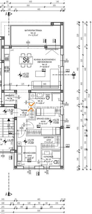 Raspored obuhvaća hodnik, dvije spavaće sobe – od kojih jedna ima vlastitu kupaonicu i garderobu – dodatnu kupaonicu, kuhinju s blagovaonicom i dnevnim boravkom, ostavu i natkrivenu terasu.OpremaApartman ima podno električno grijanje u kupaonicama, a prostorije su klimatizirane s tri klima uređaja – po jedan u dnevnom boravku i svakoj spavaćoj sobi. Stolarija je PVC s troslojnim staklom, električnim roletama i komarnicima. Podovi su obloženi keramičkim pločicama. Ulazna vrata su protuprovalna i protupožarna. Zgrada je građena ciglenim termo blokom, a fasada je izolirana slojem stiropora debljine 10 cm.