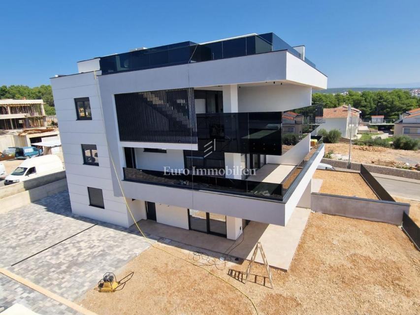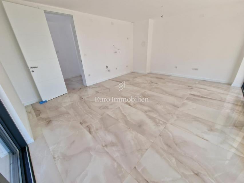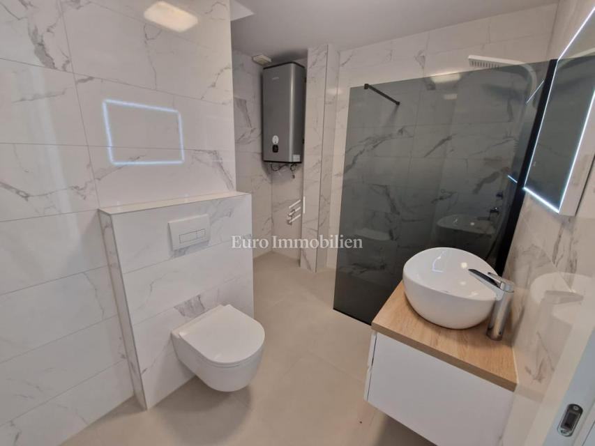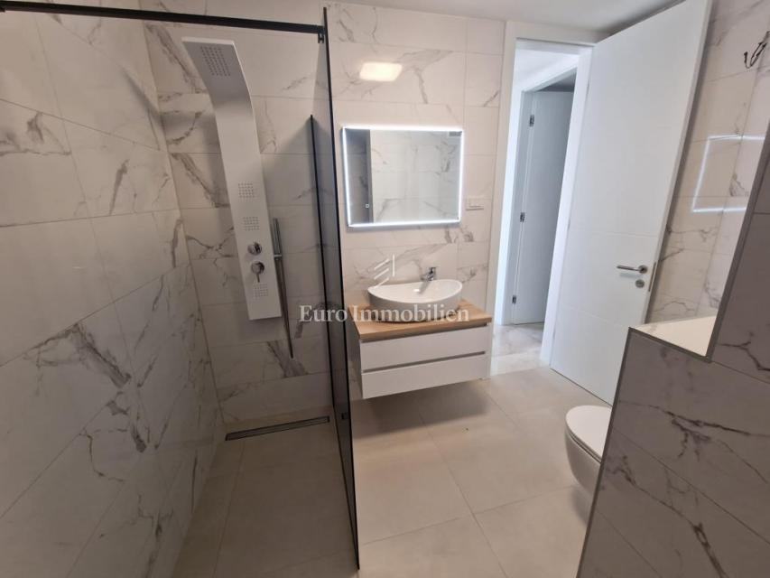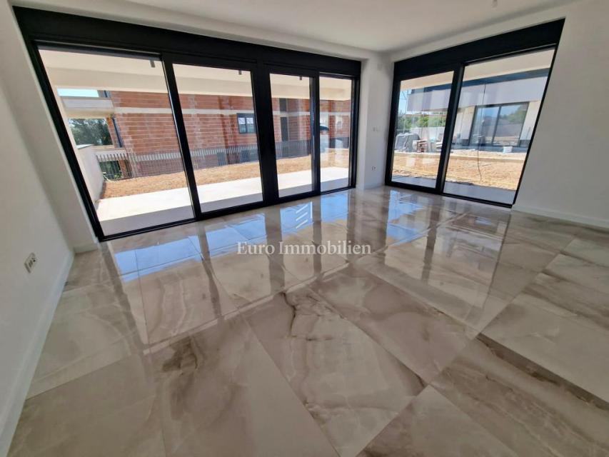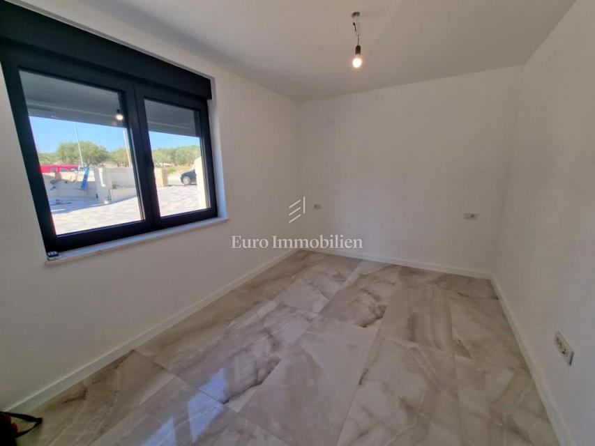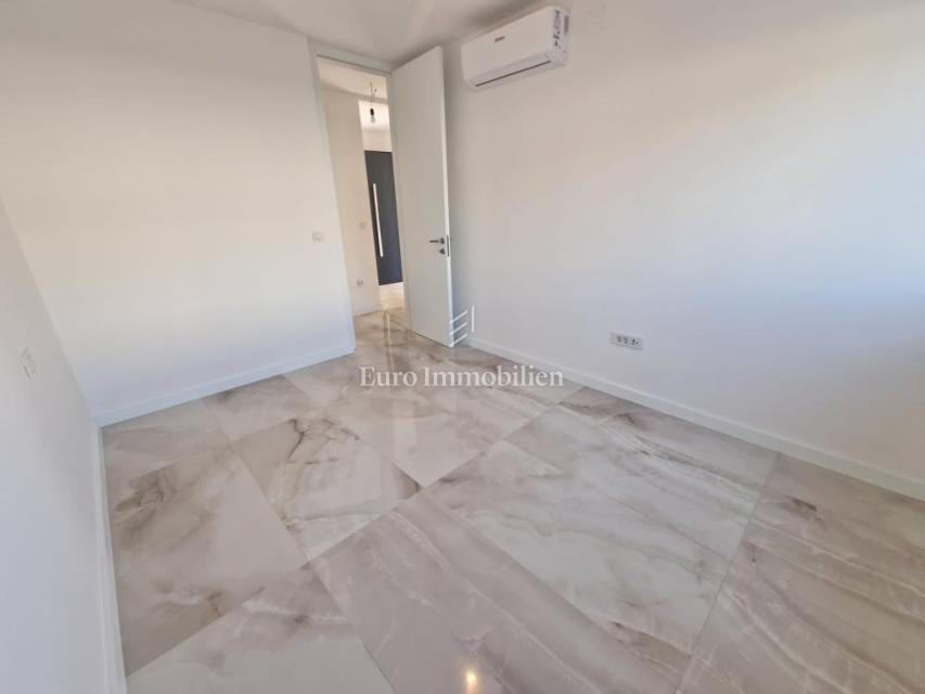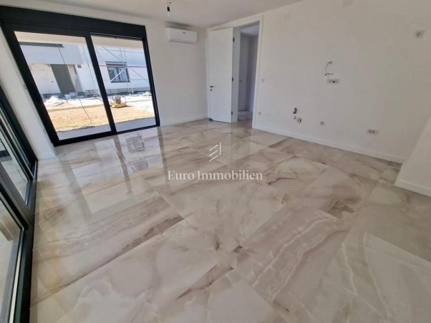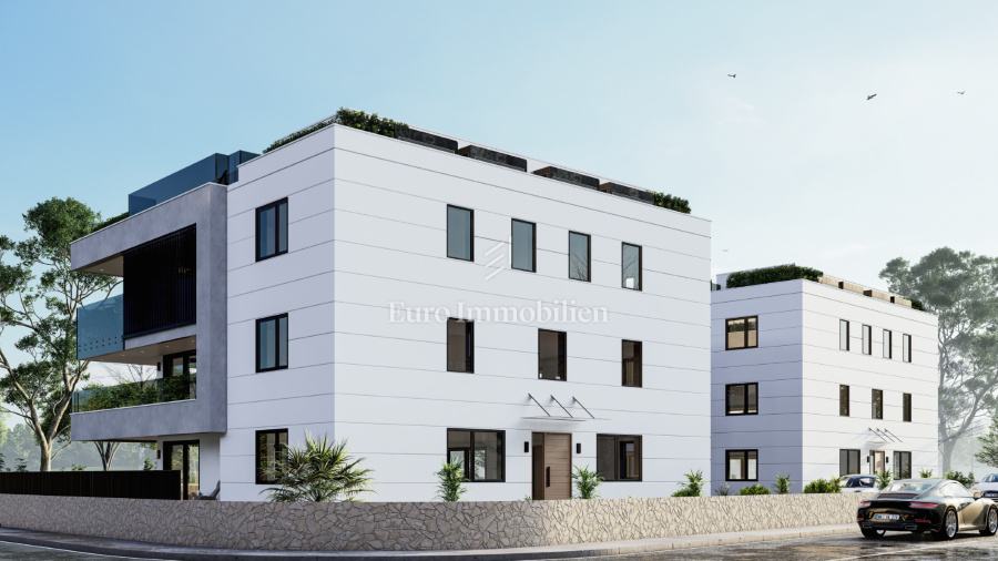 Apartman je površine 65m2 sastoji se od hodnika, dnevnog boravka, kuhinje i blagavaonice, dvije spavaće sobe, kupaonice, WC-a i terase. Terasa ima izlaz na okućnicu. Zgrada je izgrađena s najkvalitetnijim materijalima i apartmani su opremljeni klima uređajima, dizalicama topline, ALU stolarijom i prvoklasnim parketom i keramikom. Apartmanu pripada jedno parkirno mjesto. Budući vlasnik ima mogućnost ugradnje bazena na okućnici. Nekretnina se nalazi na izvanrednoj lokaciji udaljena cca 600 metara od mora i plaže. Useljenje je predviđeno do kraja 2023. godine.
