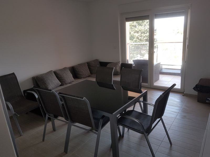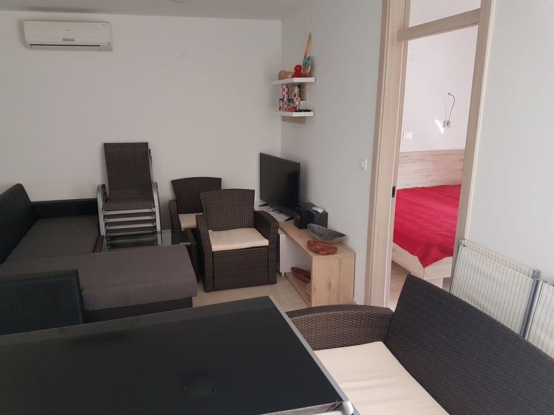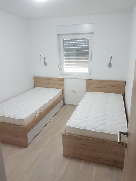 Apartman se nalazi na drugoj etaži zgrade novije gradnje, od 163 m2 napravljena su tri, svaki se sastoji od kupaone, dnevnog boravka sa kuhinjom, spavaće sobe , dječje sobe i terase ( cijeli kat ).