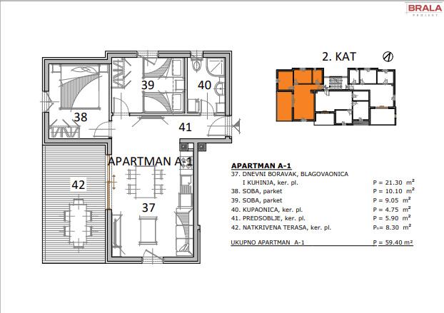 Prodaje se prekrasan trosoban apartman M-A-1 obračunske površine 59,40 m2 na drugom katu visokokvalitetene moderne zgrade od dva kata i potkrovljem u izgradnji s ukupno 8 stanova i 2 apartmana, a koji se sastoji od ulaznog hodnika, dnevnog boravka s kuhinjom i blagavaonom, dvije spavaće sobe, kupaonice s WC-om i natkrivenom terasom.