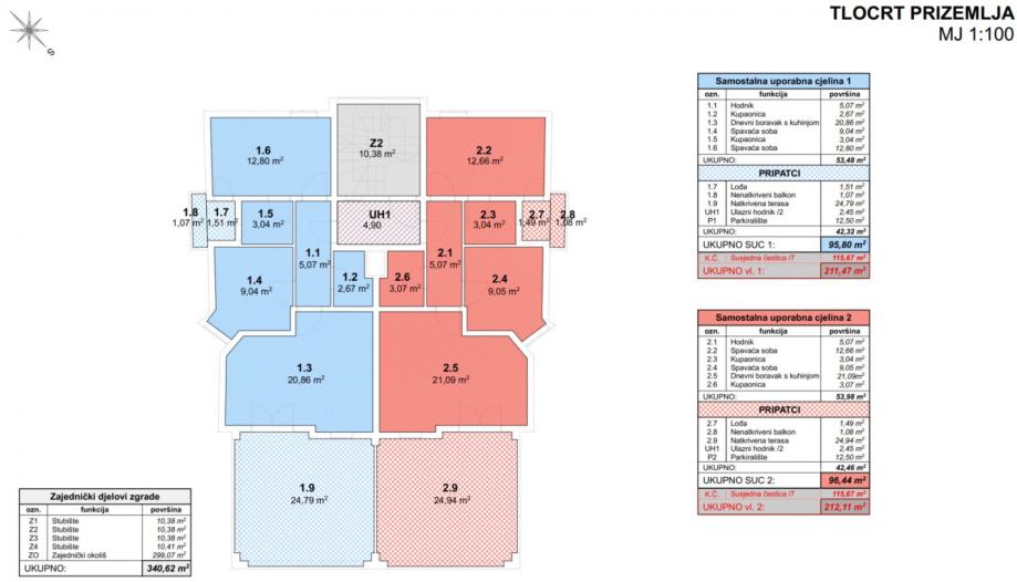 Apartmanu pripada parkirališno mjesto površine 12,50 m2 i 1/7 svih zajedničkih prostora (bazen, dvorište, spremišta, vanjski WC….)