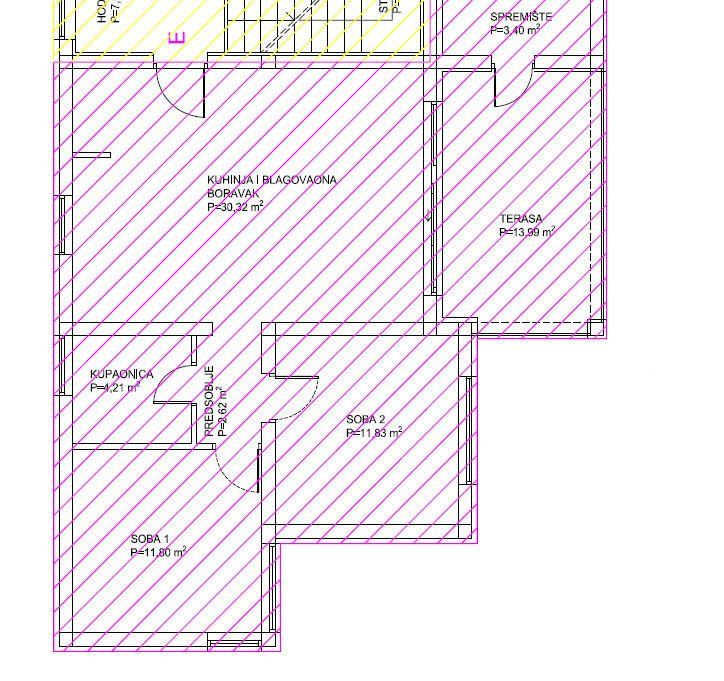 Stan E – Apartman je ukupne površine 75.47m2 od čega je 60.78m2 stambeno + 1.70m2 spremište(obračunski) + terasa 10.49m2(obračunski). Apartman se nalazi na 2 katu apartmanske zgrade.