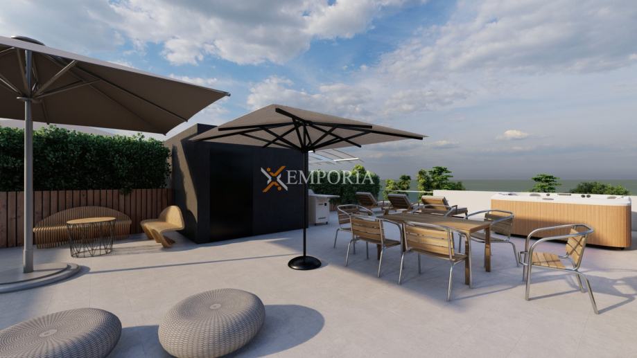 Na prodaju je moderan apartman u Pakoštanima, udaljen svega 520 m od mora i 650 m od centra mjesta. Nalazi se na drugom katu novogradnje čiji je završetak planiran za 2026. godinu. Ukupna neto površina s pripacima iznosi 111,23 m², dok stambeni dio zauzima 108,73 m². Posebnu vrijednost ovoj nekretnini daju velika krovna terasa površine 97,32 m² te mirna lokacija.