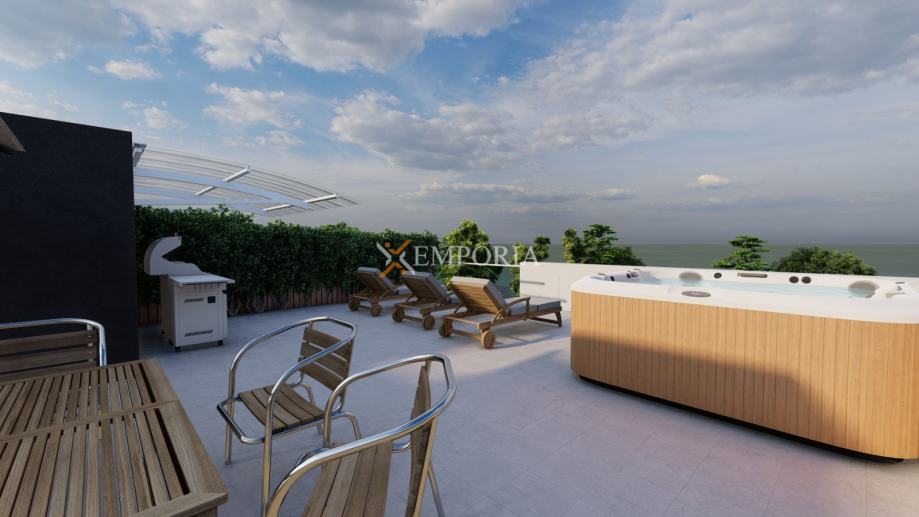 Raspored prostorija uključuje hodnik, spavaću sobu, dodatnu spavaću sobu s vlastitom kupaonicom, još jednu kupaonicu te kuhinju s blagovaonicom i dnevnim boravkom. Iz dnevnog prostora izlazi se na lođu, dok sobe imaju izlaz na natkrivenu terasu. Iz stubišta se penje na prostranu krovnu terasu, idealnu za odmor i druženja. Apartmanu pripada i jedno parkirno mjesto.