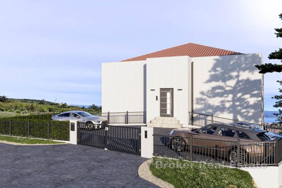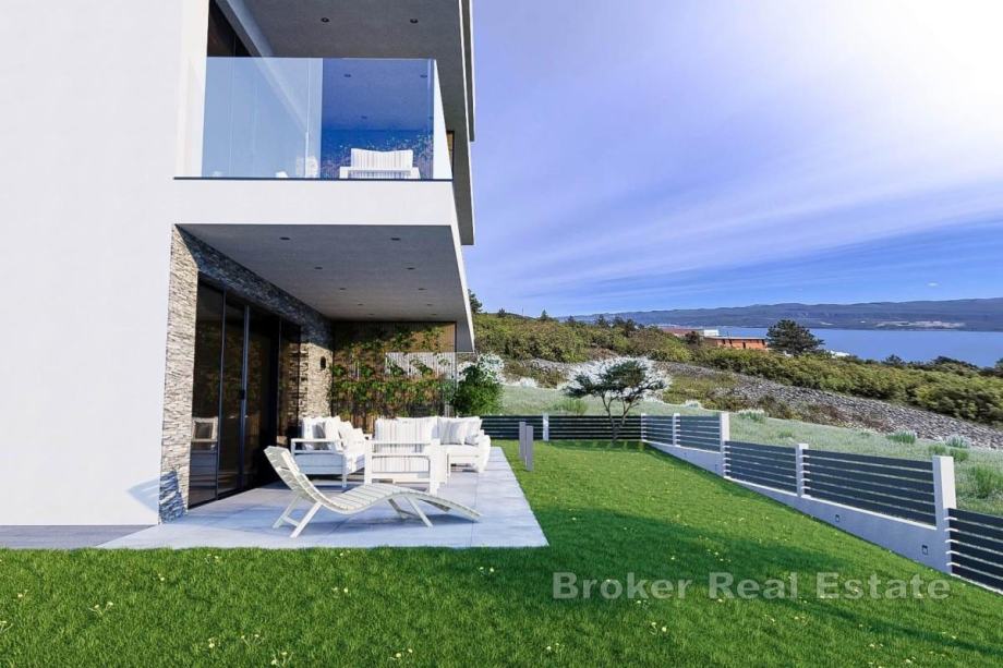 Zgrada je izrađena kvalitetnom gradnjom s vrhunskom keramikom i podnim oblogama, modernim sanitarijama, PVC vanjskom stolarijom s velikim kliznim staklenim stijenkama, podnim grijanjem i hlađenjem, protuprovalnim vratima te klimatiziranim sustavom grijanja i hlađenja. Posebna prednost je lokacija s otvorenim panoramskim pogledom, udaljena oko 500 metara od plaža i centra Vrbnika.