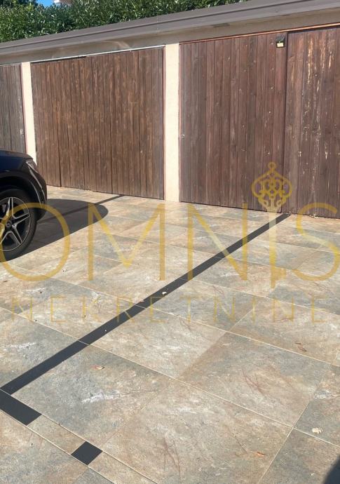 Stanu pripada i velika terasa površine 40 m2 ispred sjeverozapadnog dijela zgrade, idealna za opuštanje i druženje na otvorenom, kao i okućnica površine 200 m2 s mediteranskim biljem i pogledom na more. U cijenu su uključeni jedno parkirno mjesto i garaža od 5 m2 (idealna za bicikle, motor ili dodatno spremište).