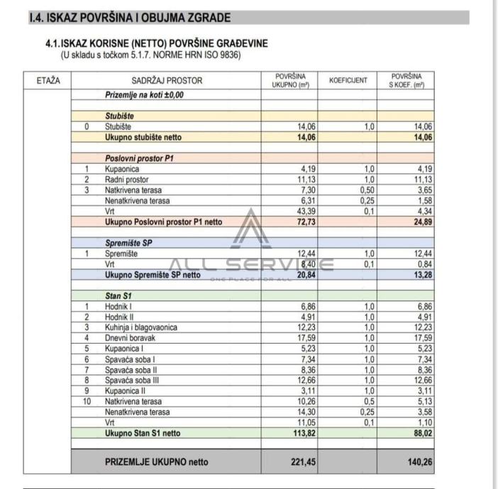 Stanu u projektu bruto površine pripadaju vrt 50m2, vanjsko parking mjesto 12,50, natkrivena terasa i nenatkrivena terasa ukupne površine 14m2.