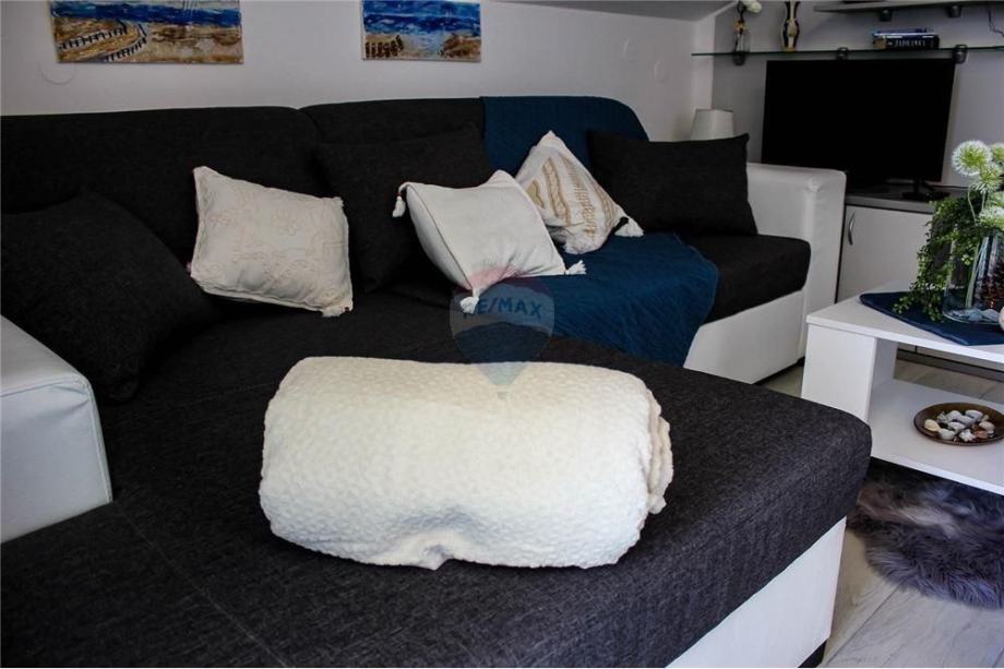 Apartman je opremljen kvalitetnim namještajem po mjeri, što osigurava funkcionalnost i estetski privlačan izgled prostora.