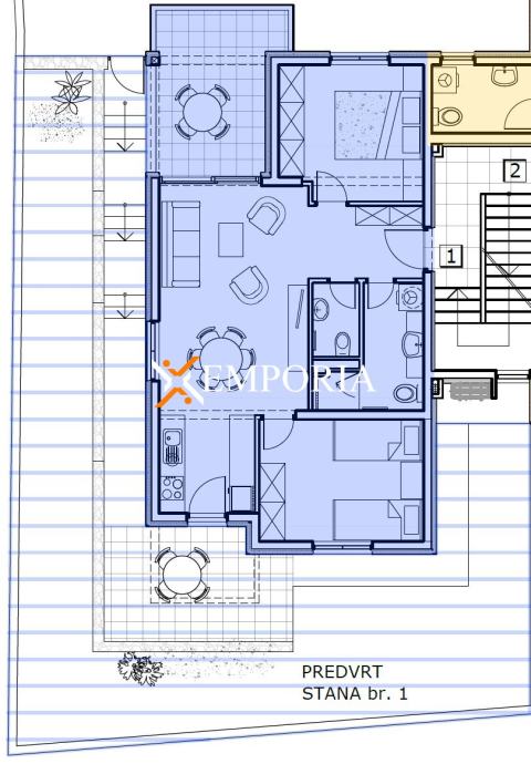 U zgradi se nalaze ukupno 4 stana. Udaljenost od centra mjesta iznosi svega 400 m.OpremaPodne obloge su pločice i parket. Fasada ima termoizolaciju od vune debljine 10 cm. Prozori su od PVC materijala s roletama, komarnicima i troslojnim staklom. Dnevni boravak i spavaće sobe su klimatizirane. U kupaonici se postavlja podno grijanje. Ulazna vrata su protuprovalna i protupožarna.