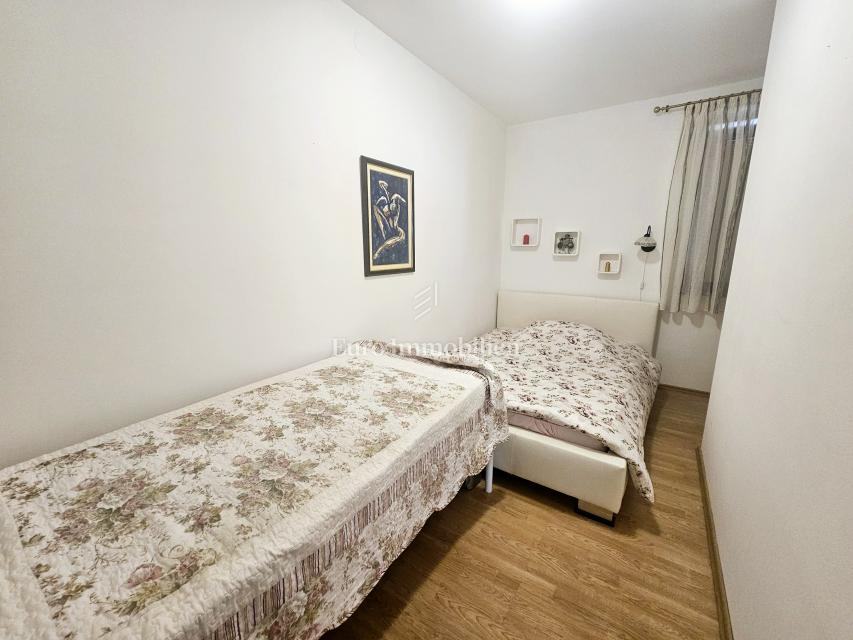 Apartman u prizemlju površine 71,40 m2 koji se sastoji od dvije spavaće sobe, dnevnog boravka s kuhinjom i blagovaonom, kupaone i terase. Stan ima lijepo uređenu okućnicu, jedno parkirno mjesto i odvojeno spremište.