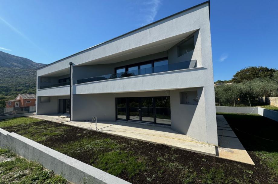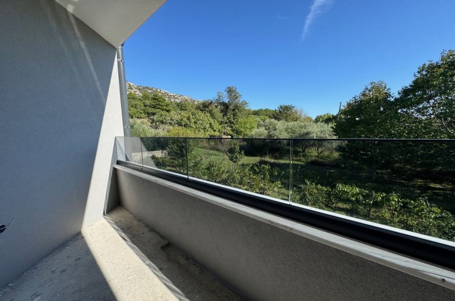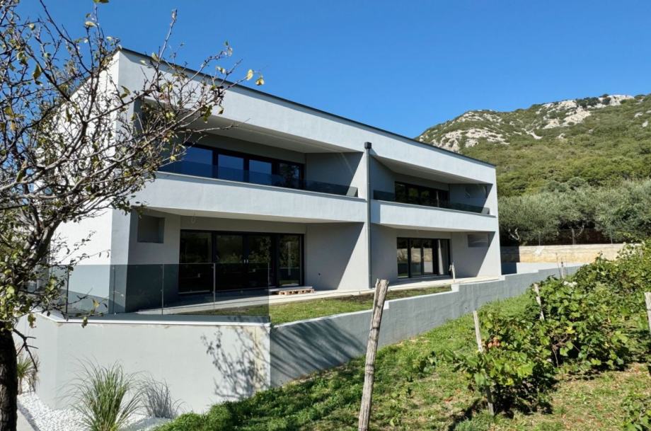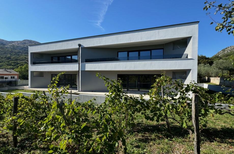 Otok Krk, Baška, šire područje, prodaja novog apartmana površine 64,05 m2, na prvom katu apartmanske zgrade, 4000 m od mora. Apartman se sastoji od dvije spavaće sobe, dnevne sobe s kuhinjom i blagovaonom, kupaonice, hodnika, balkona površine 10,33 m2 te spremišta u prizemlju zgrade. Kvalitetna gradnja i oprema, ALU stolarija, klimatizacija, toplinska izolacija, dva parkirna mjesta.