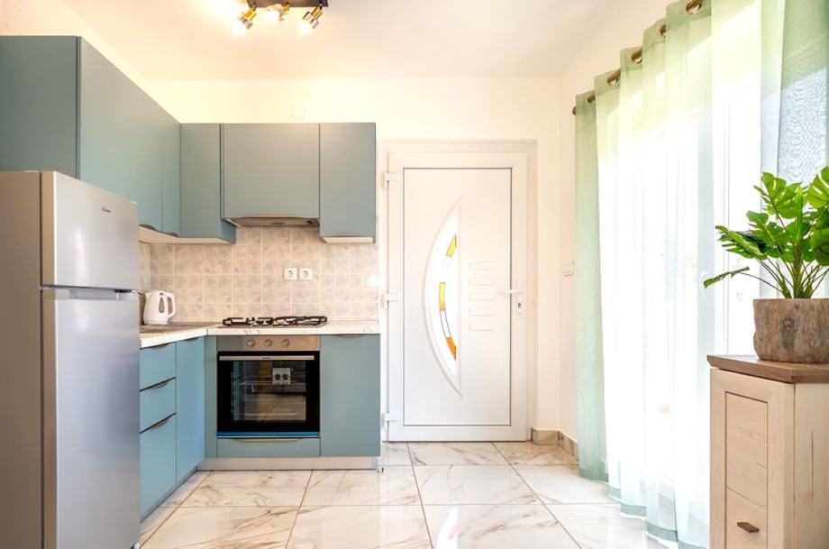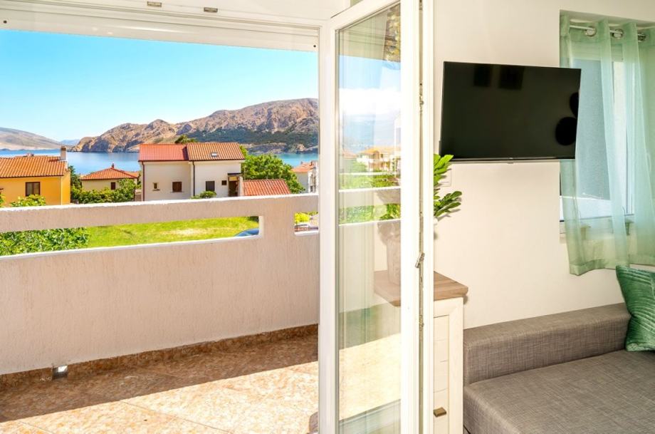 Otok Krk, Baška, prodaja dva apartmana ukupne površine 74,23 m2, na prvom katu stambene zgrade, na mirnoj lokaciji, 400 m od mora i centra. Apartman 1 površine 36,23 m2 sastoji se od jedne spavaće sobe, dnevne sobe s kuhinjom i blagovaonom, hodnika, kupaonice i terase. Apartman 2 površine 38 m2 sastoji se od dvije spavaće sobe, dnevne sobe s kuhinjom i blagovaonom, kupaonice, vanjskog stubišta i terase. Kvalitetna gradnja i oprema, klimatizacija, dva parkirna mjesta.