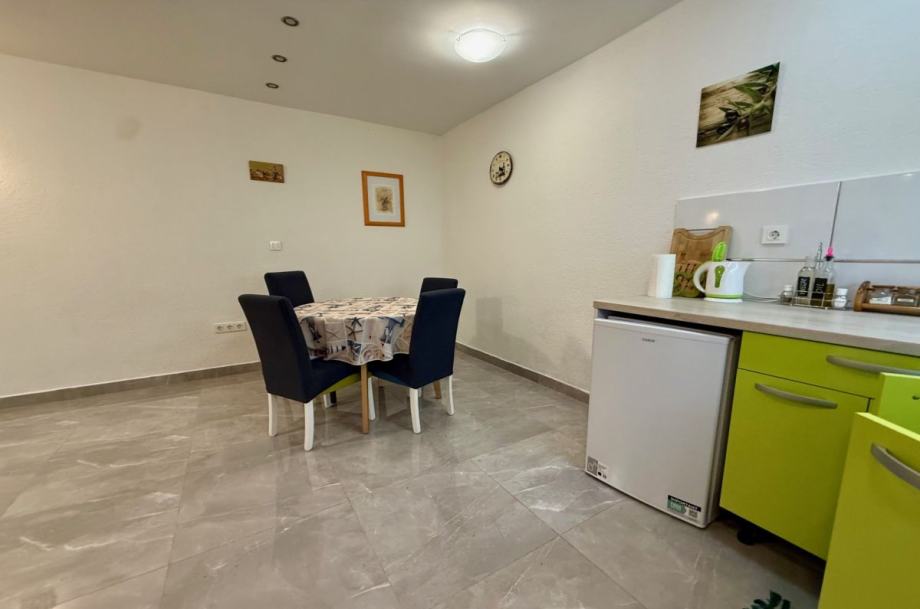 Otok Krk, Malinska, prodaja opremljenog apartmana površine 36,27 m2, u suterenu apartmanske zgrade, s okućnicom površine 81 m2. Apartman se sastoji od spavaće sobe, dnevne sobe s kuhinjom i blagovaonom i kupaonicom. PVC stolarija, klimatizacija, parkirno mjesto. Udaljenost od plaže 800 m.