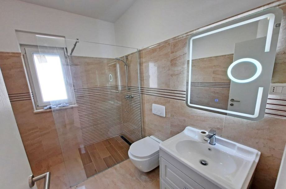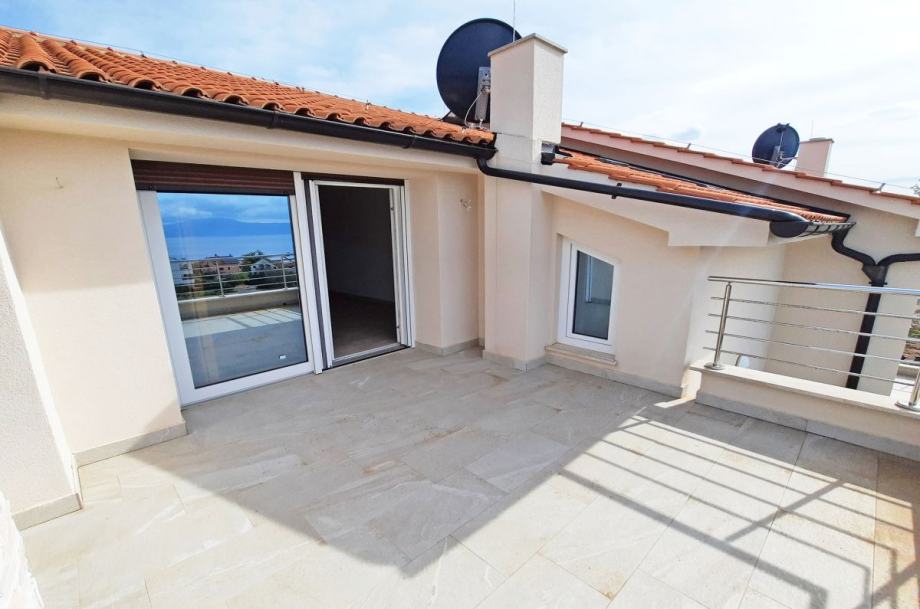 Otok Krk, Njivice, prodaja novog apartmana površine 67,99 m2, u potkrovlju apartmanske zgrade s pogledom na more. Apartman se sastoji od dnevne sobe, kuhinje, blagovaone, dvije spavaće sobe, kupaonice, hodnika i nenatkrivene terase. Kvalitetna gradnja i oprema, PVC stolarija, klimatizacija, parkirno mjesto. Mirna lokacija, 1500 od mora.