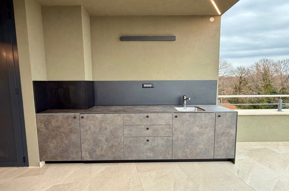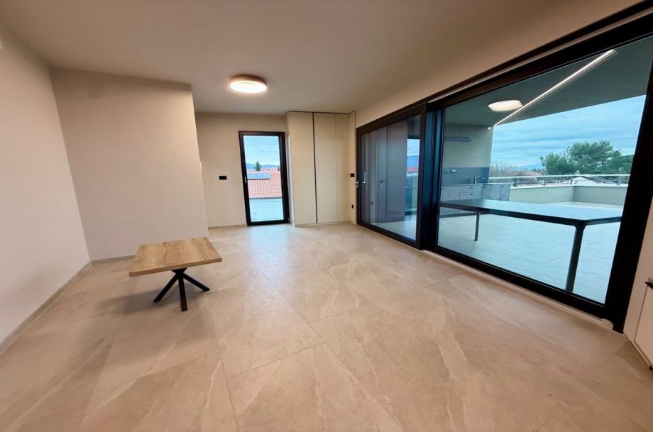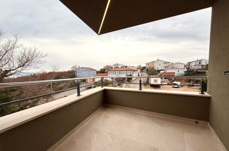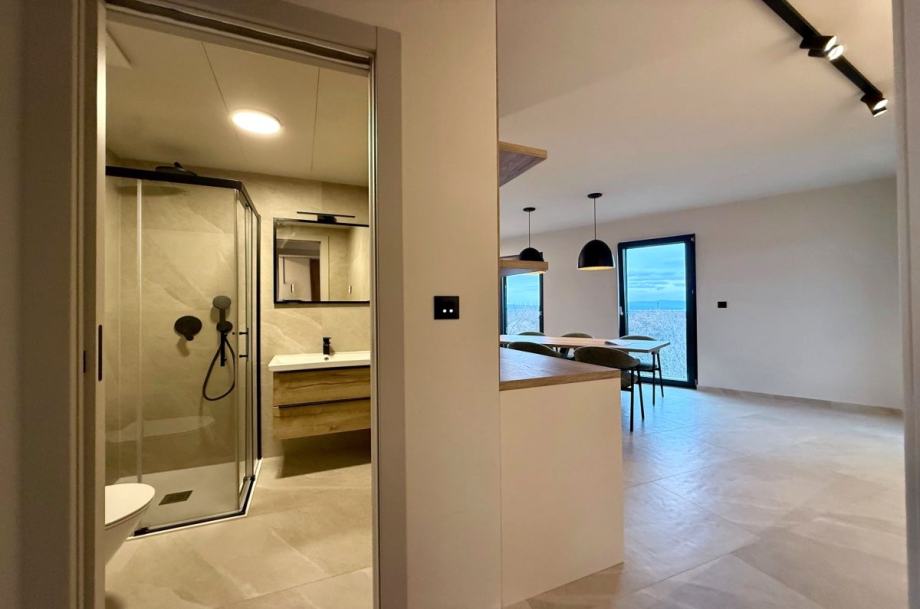 Otok Krk, Omišalj, prodaja novog Penthousa površine 81,54 m2, na prvom katu moderne stambene zgrade suvremenih linija i dizajna s ukupno pet stambenih jedinica s otvorenim pogledom na more. Apartman se sastoji od dvije spavaće sobe, dnevne sobe s kuhinjom i blagovaonom, dvije kupaonice i dvije natkrivene terase. Vrhunska kvaliteta gradnje i opreme, visokokvalitetna PVC stolarija s RAL ugradnjom, ALU rolete i komarnici (proizvođač ABS, talijanske kvalitete), talijanska sobna vrata, namještaj po mjeri, vrhunska sanitarna oprema, toplinska pumpa grijanje i hlađenje (Fissman), klimatizacija, parkirno mjesto. Mirna lokacija.Zgrada je građena od vrhunskih materijala i opremljena najkvalitetnijom opremom, s A+ energetskim razredom koji osigurava visoku energetsku učinkovitost i niske troškove režija.Ova nekretnina predstavlja idealan spoj za cjelogodišnje stanovanje i ljetovanje, kao i odličnu priliku za investiciju.
