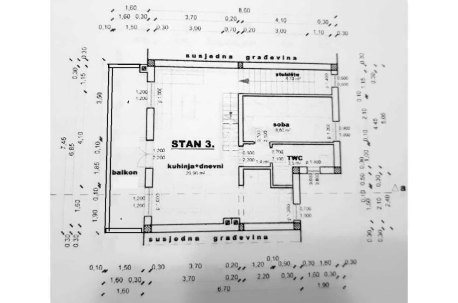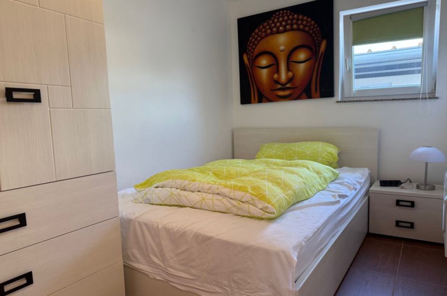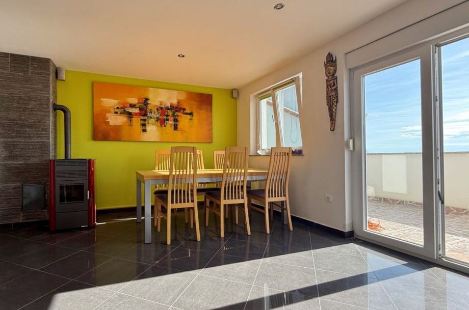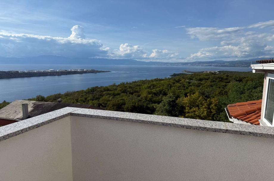 Otok Krk, Omišalj, prodaja opremljenog dvoetažnog apartmana površine 72 m2, s pogledom na more. Apartman se sastoji od prvog kata s dnevnom sobom s kuhinjom i blagovaonom, spavaćom sobom, kupaonicom i balkonom od 15 m2 te neuređenog potkrovlja korisne površine 22 m2 gdje se mogu urediti dvije spavaće sobe i kupaonica. PVC stolarija, klimatizacija, parkirno mjesto. Mirna lokacija, 1000 m od plaže.