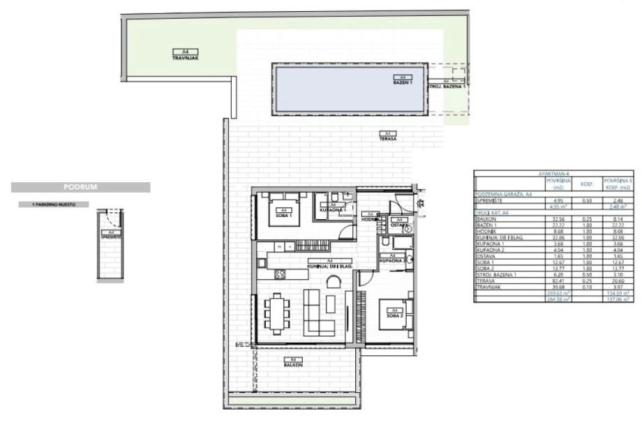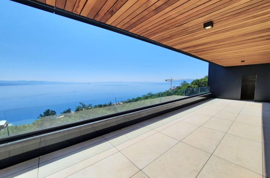 Opatija, prodaja novog ekskluzivnog apartmana površine 77 m2, na drugom katu apartmanske vile, s bazenom, pogledom na more i uređenom okućnicom površine 151 m, na atraktivnoj lokaciji, 300 m od plaže. Apartman se sastoji od dnevne sobe, kuhinje, blagovaone, dvije spavaće sobe s vlastitim kupaonicama, ostave, hodnika, balkona, terase površine 33 m2 te spremišta u podrumu. Vrhunska kvaliteta gradnje i opreme, Schuco aluminijska stolarija s troslojnim staklom, električne rolete, klimatizacija, podno grijanje, sigurnosni sustav, dizalo, garažno parkirno mjesto.