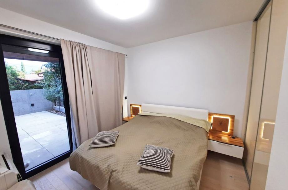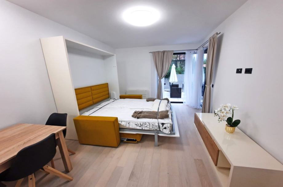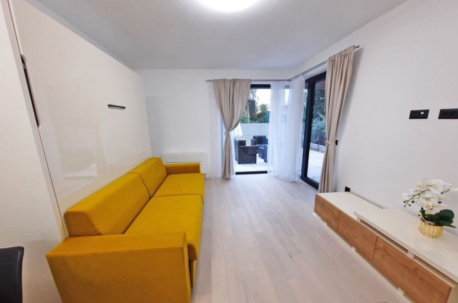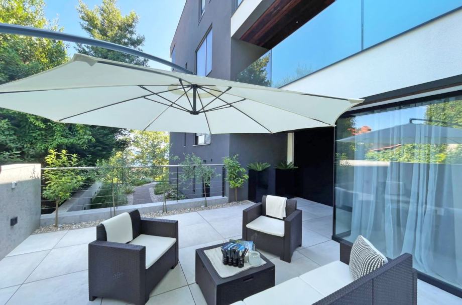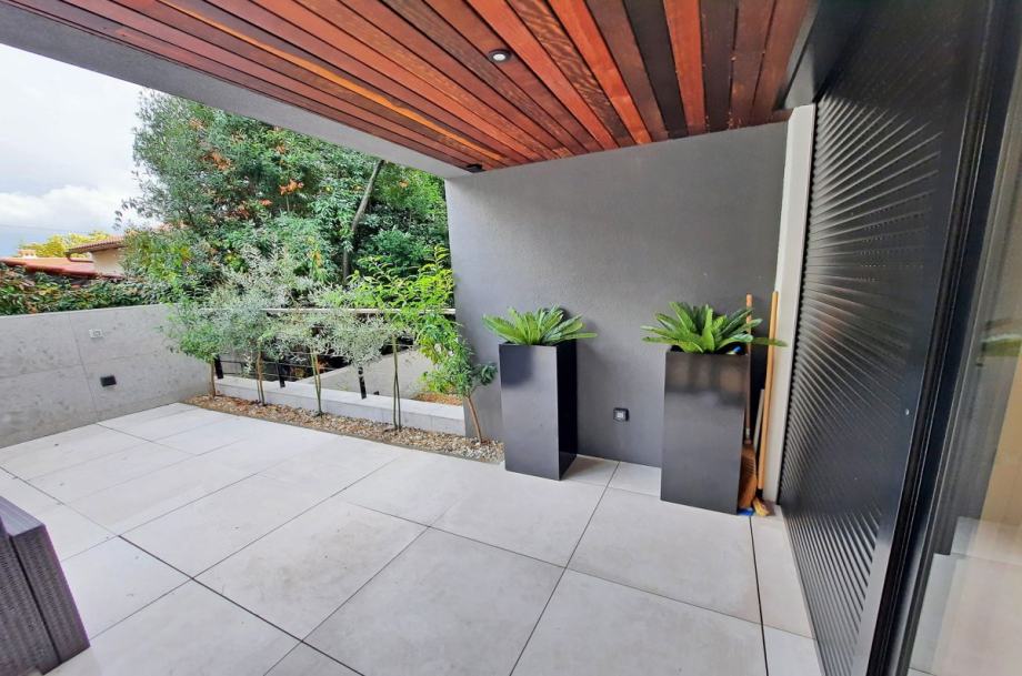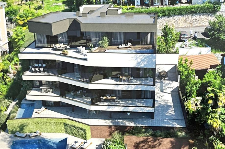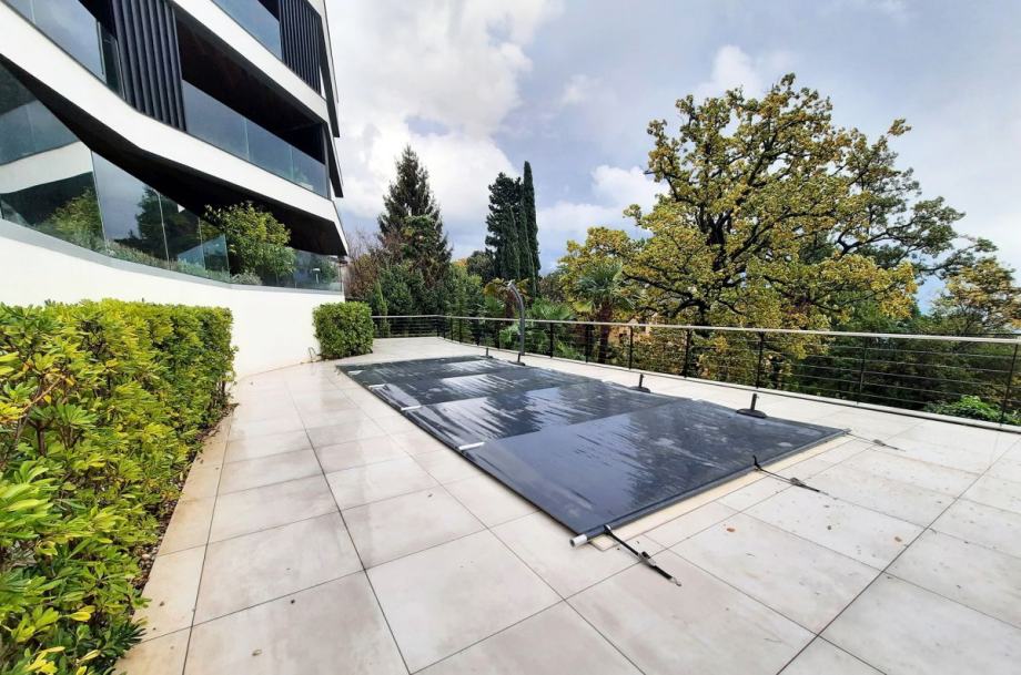 Opatija, prodaja opremljenog apartmana površine 45,70 m2, s zajedničkim bazenom i uređenom okućnicom površine 32,80 m2. Apartman se sastoji od dnevne sobe, kuhinje, blagovaone, spavaće sobe, kupaonice, spremišta i natkrivene terase. Klimatizacija, parkirno mjesto. Atraktivna lokacija, 200 m od mora.