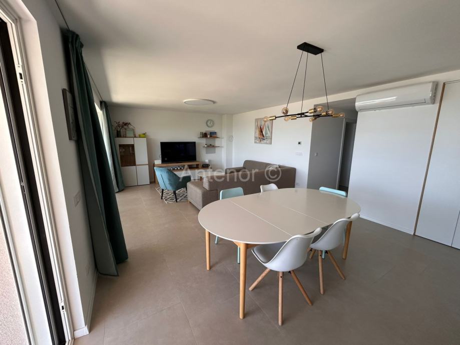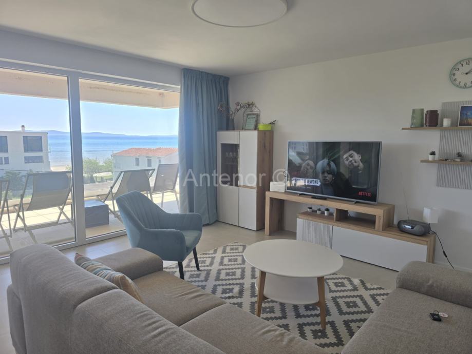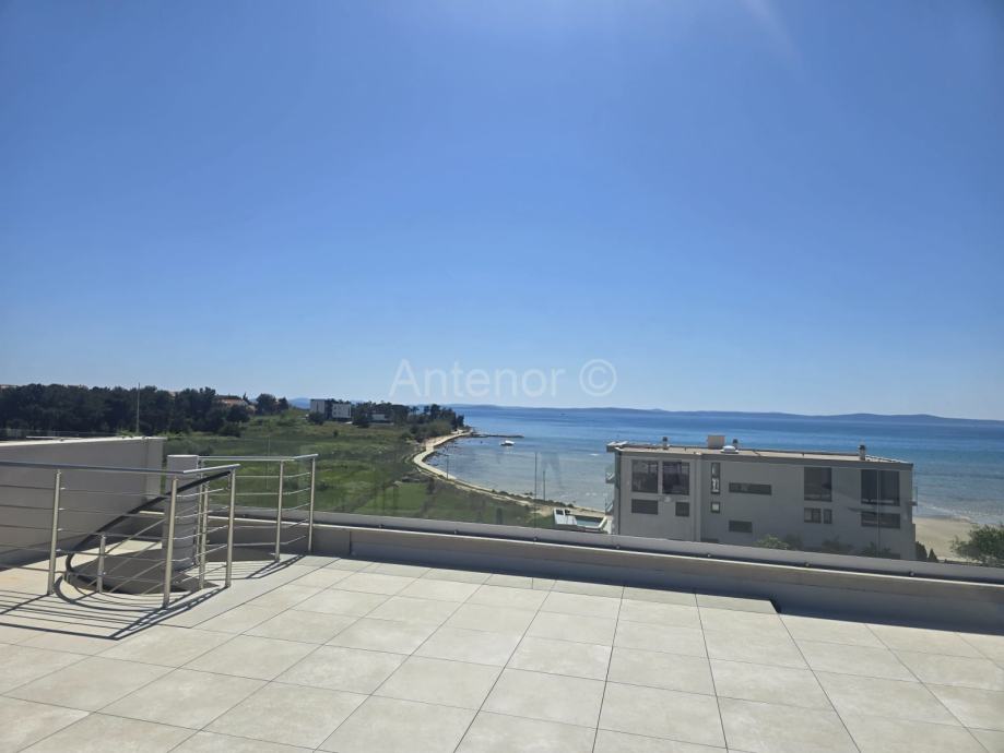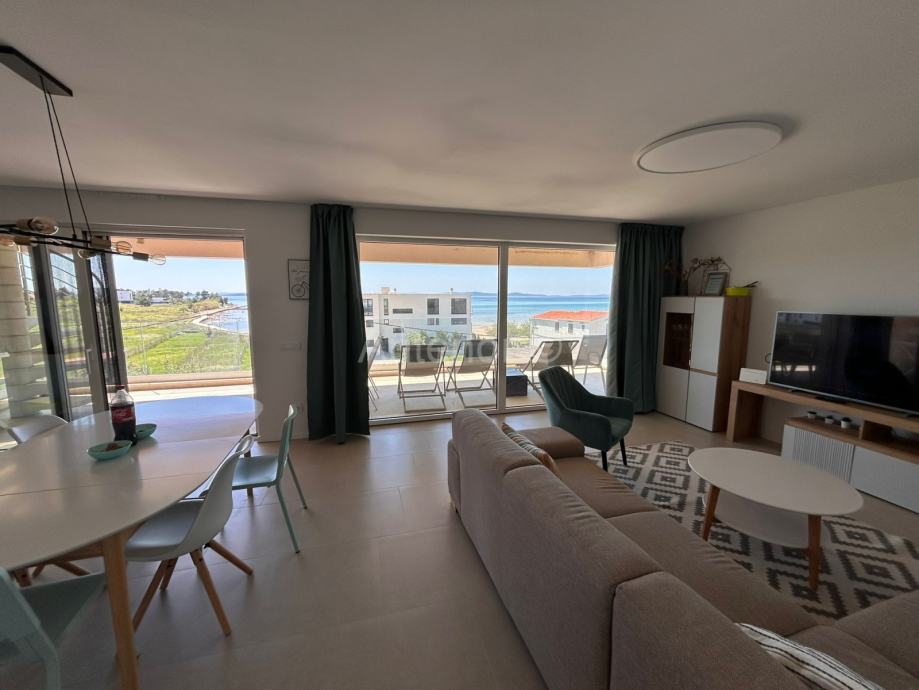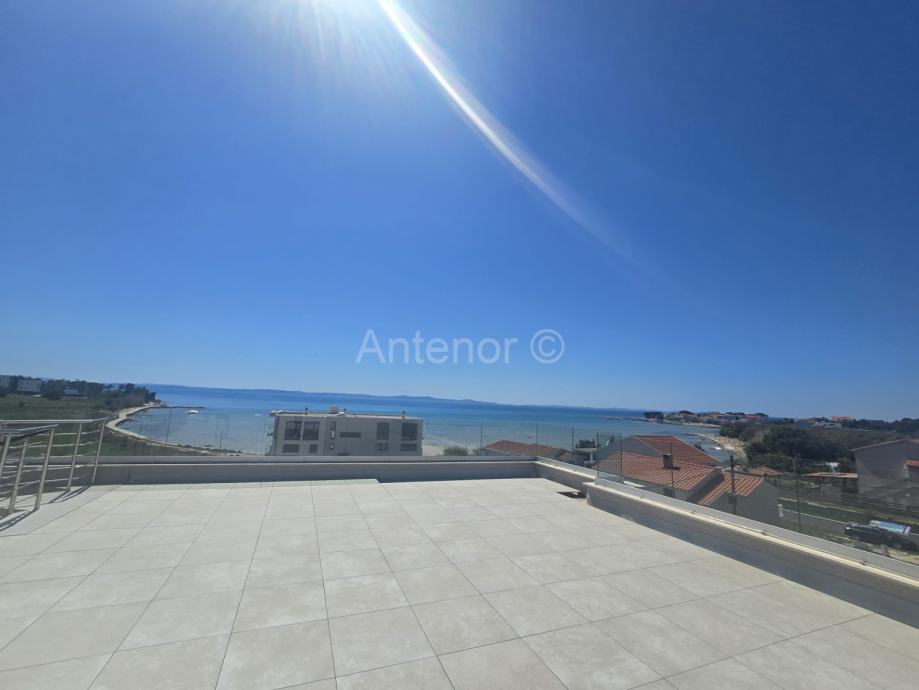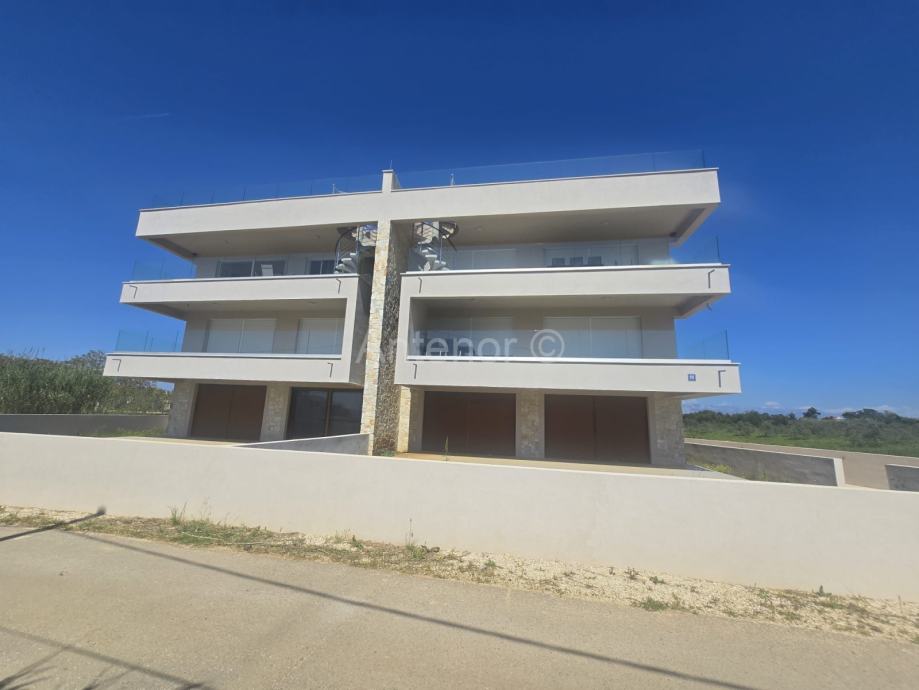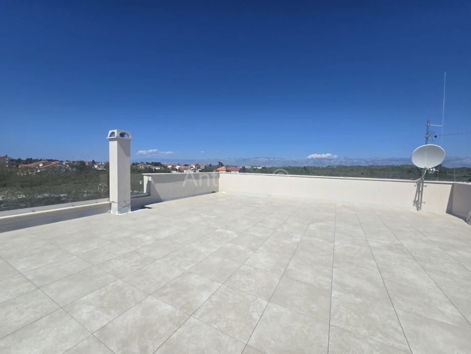 PRIVLAKA - Prodaje se apartman S6 na drugom katu apartmanske zgrade sa šest apartmana, u 2. redu od mora. Apartman se sastoji od kuhinje, blagavaonice, dnevnog boravka, tri spavaće sobe, dvije kupaonice, praonice te natkrivene terase površine 23,80 m2. Ukupna površina apartmana je 101,15 m2. Stanu pripada i krovna terasa površine 130,00 m2 te jedno parkirno mjesto.