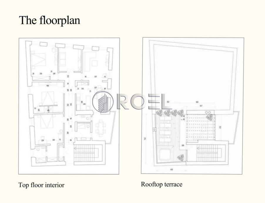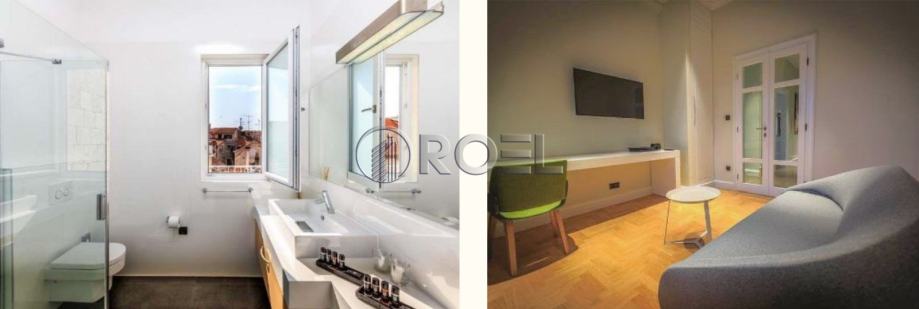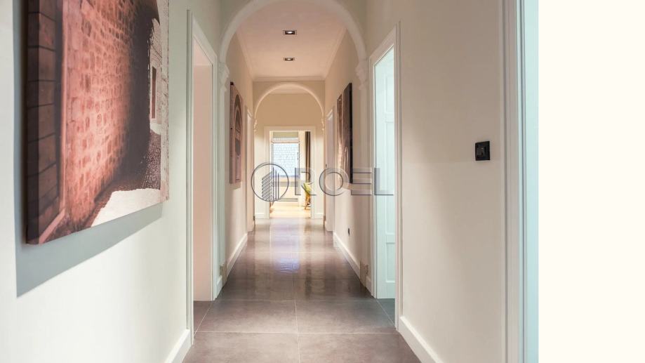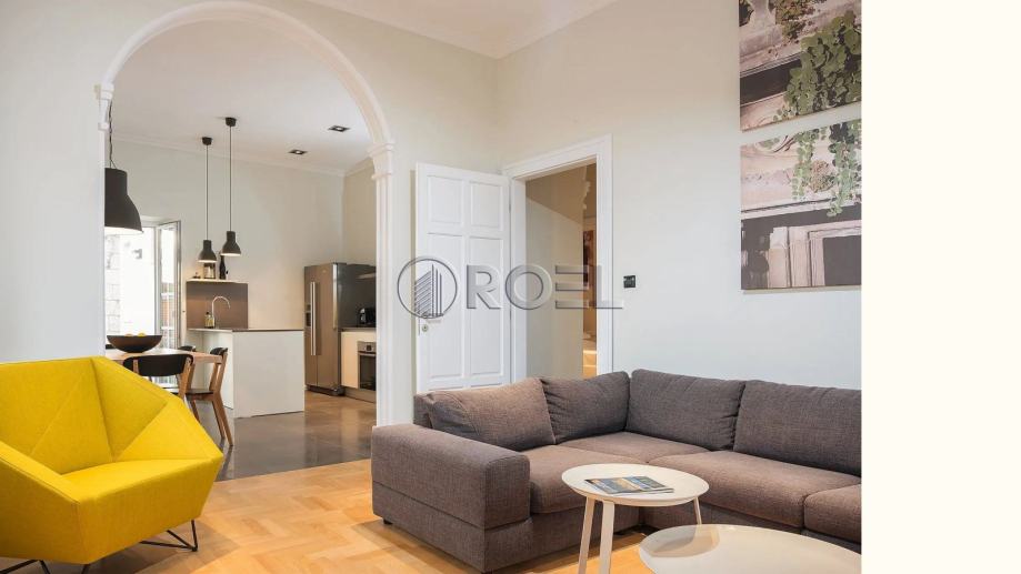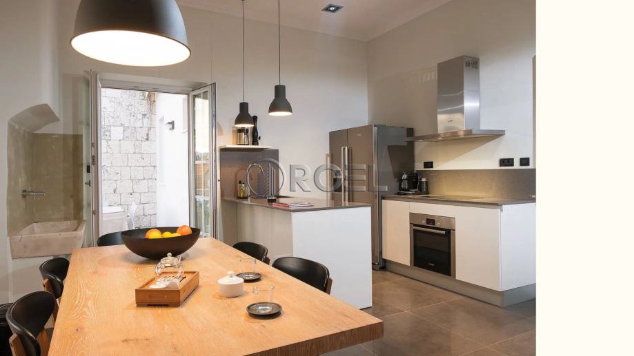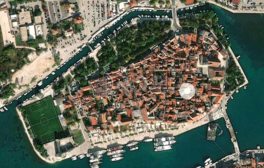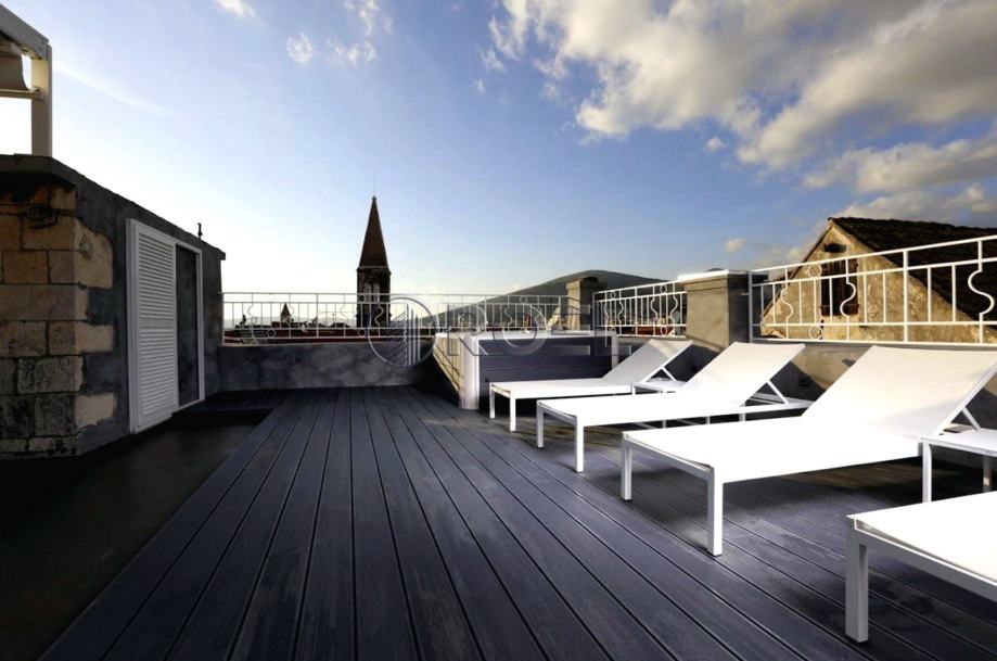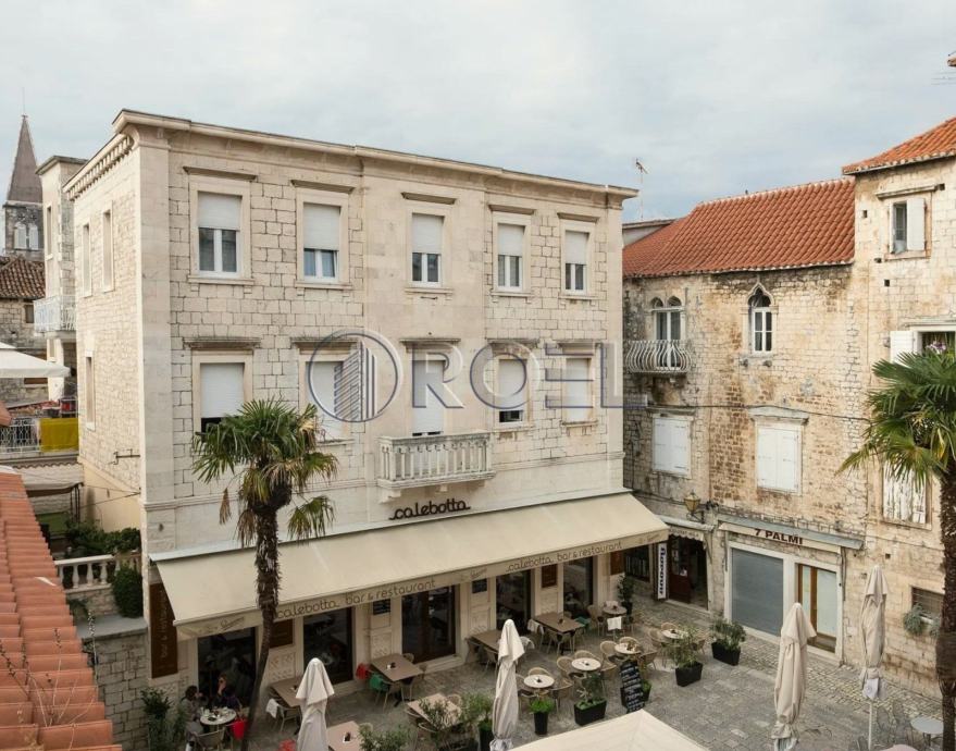 Četverosobni stan smješten na drugom katu u starogradnji iz 1928. godine u strogom centru Trogira, NKP 198,04 m2. Zgrada je spomenik kulture odnosno kulturno dobro. Stan se sastoji od tri spavaće sobe, radne sobe, kuhinje, blagovaonice, dnevnog boravka, dvije kupaonice, wc-a, garderobe i ostave. Na pripadajućoj krovnoj terasi je uređeno sučalište i lounge s jacuzzijem. Stvarna površina stana iznosi 321 m2 od čega je 142,66 m2 zatvorene površine , 12,49 m2 nenatkriveni balkon te 151,42 m2 prostranoj krovna terasa s prekrasnim pogledom. Nalazi se svega 100 metara od mora. Adaptiran je 2020. godine.
