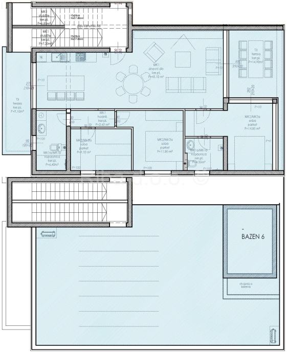 Ovaj apartman nalazi se na katu i sastoji se od tri spavaće sobe, dvije kupaone, kuhinje, blagovaonice i dnevnog boravka iz kojeg se izlazi na terasu. Stepenicama se izlazi na veliku krovnu terasu površine 100 m2 nakojoj se nalati i bazen površine 15 m2