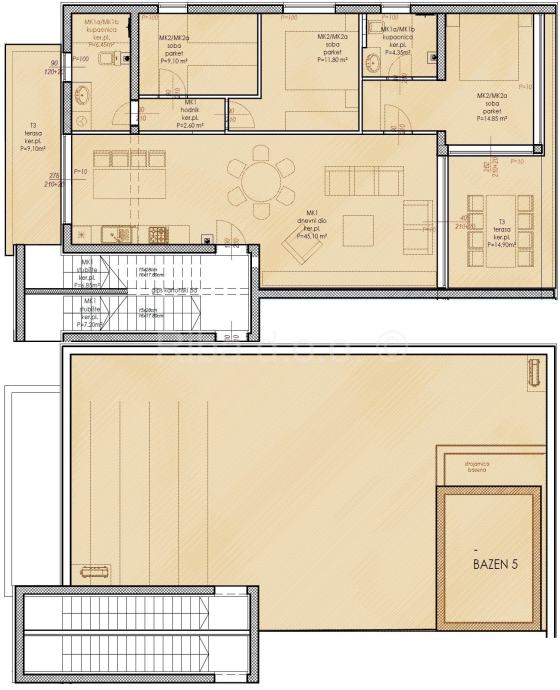 Ovaj apartman nalazi se na katu i sastoji se od tri spavaće sobe, dvije kupaone, kuhinje, blagovaonice i dnevnog boravka iz kojeg se izlazi na terasu. Stepenicama se izlazi na veliku krovnu terasu površine 100 m2 nakojoj se nalati i bazen površine 15 m2