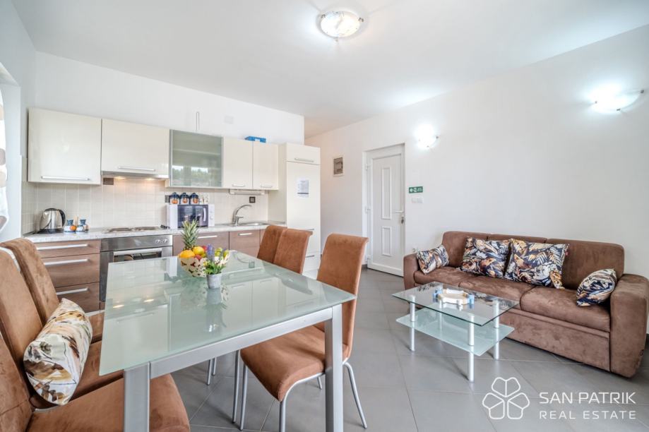 Zgrada je izgrađena 2007. godine i sastoji se od 6 funkcionalnih dvosobnih apartmana. Svaka jedinica ima vlastito parkirno mjesto, vanjske prostore i otvoren pogled na more. Apartmani su potpuno namješteni, klimatizirani i spremni za korištenje bez dodatnih ulaganja.