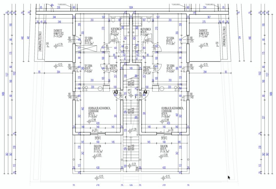 Stan A3 - 1. kat - stambena površina 48,70 m2 (2 spavaće sobe + kupaonica) + natkrivena terasa (14,79 m2 - J) + nenatkrivena terasa (14,20 m2 - Z) + vanjsko parking mjesto P3, ukupna neto površina 61,77 m2 = 270.000 EUR
