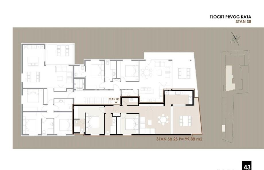 Apartman S8 smještena je na drugom katu i sastoji se od hodnika,dvije kupaone, dvije spavaće sobe, kuhinje s dnevnim boravkom, cw, natkrivenom terasom, ostava (spremište br,8) 2.80 m2.