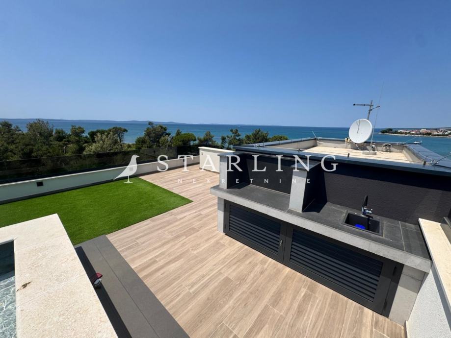 Apartman se sastoji od dnevnog boravka s blagovaonicom, kuhinje, dvije spavaće sobe, dvije kupaonice , hodnika i prostrane terase koja se nalazi na krovu zgrade.