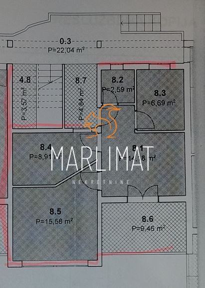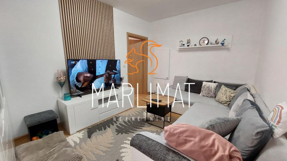 Apartman se sastoji od: hodnika, dnevnog boravka, kuhinje s blagovaonicom, 2 spavaće sobe, kupaonice, ostave, zatvorene lođe te parkirnog mjesta.
