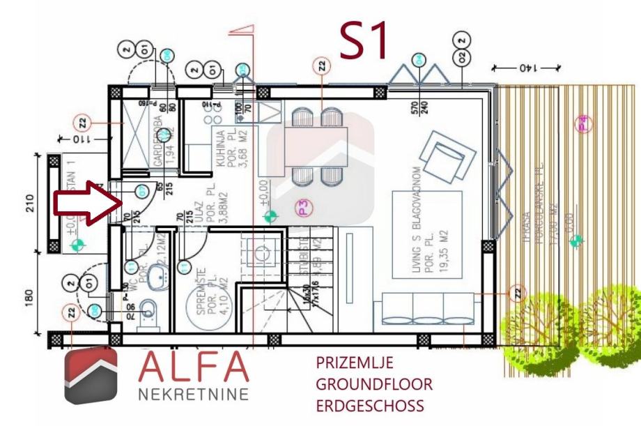 - U prizemlju je ulazni hodnik, zaseban toalet, garderoba, spremište, kuhinja sa blagovaonicom i dnevnim boravkom iz kojeg se ide na terasu i dvorište.