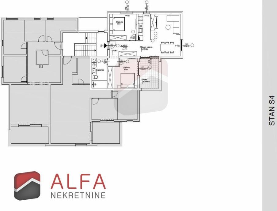 Stan S4 se nalazi na prvom katu zgrade moderne arhitekture koja ima samo dvije etaže. Ovaj stan sadržava unutarnji stambeni prostor od 74,46 m2 + natkrivena terasa 9,59 m2 + dva parkirna mjesta svako od 12,50 m2. Sveukupno sa redukcijskim koeficijentima stan ima ukupnu korisnu površinu od 84,26 m2.