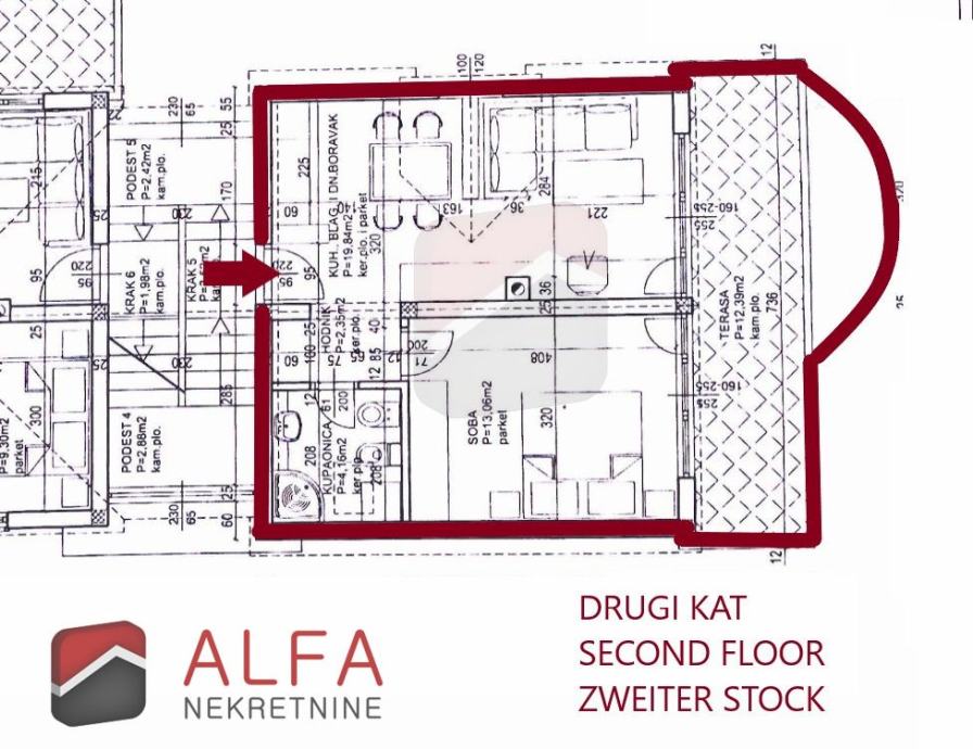 Stan ima površinu od 45,61 m i sastoji se od hodnika, jedne spavaće sobe, kupaonice, te kuhinje s blagovaonicom i dnevnim boravkom sa izlazom na terasu sa lijepim panoramskim pogledom na grad i more.
