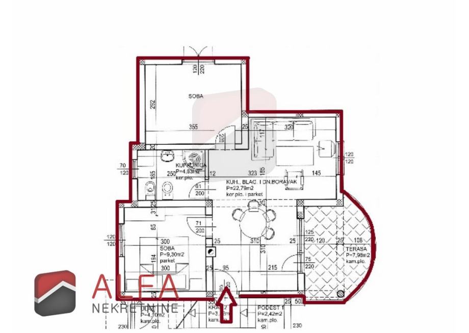 Stan ima površinu od 54,83 m i sastoji se od hodnika, dvije spavaće sobe, kupaonice, te kuhinje s blagovaonicom i dnevnim boravkom sa izlazom na terasu.