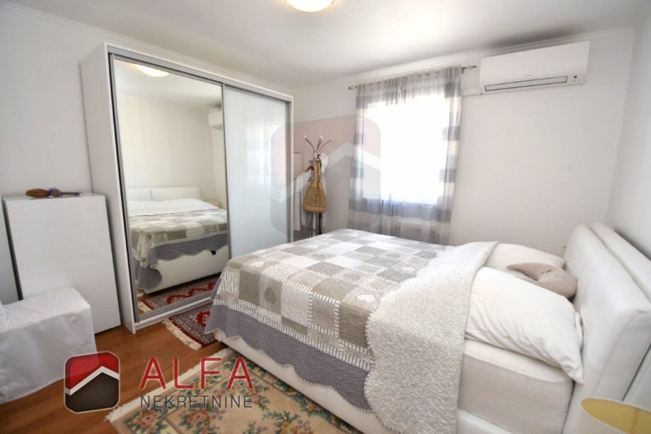 Oprema stana: protuprovalna vrata, ALU stolarija sa ugrađenim komarnicima, u kupaonici podno grijanje, 3 klima uređaja (u spavaćim sobama i dnevnom boravku), parket u spavaćim sobama.