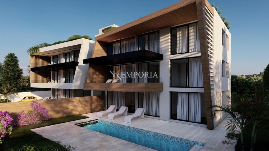 Apartmanu pripada i vrt površine oko 150 m², koji pruža dodatni prostor za boravak na otvorenom, kao i dva parkirna mjesta.OpremaNekretnina je građena od ciglenog termo bloka, s aluminijskom stolarijom (troslojno staklo, elektrorolete, komarnici) i stiropor fasadom debljine 10 cm. Podne obloge kombiniraju pločice i parket, ulazna vrata su protuprovalna i protupožarna, a odvodnja je spojena na kanalizaciju. Zgrada ima novi, ravni betonski krov.