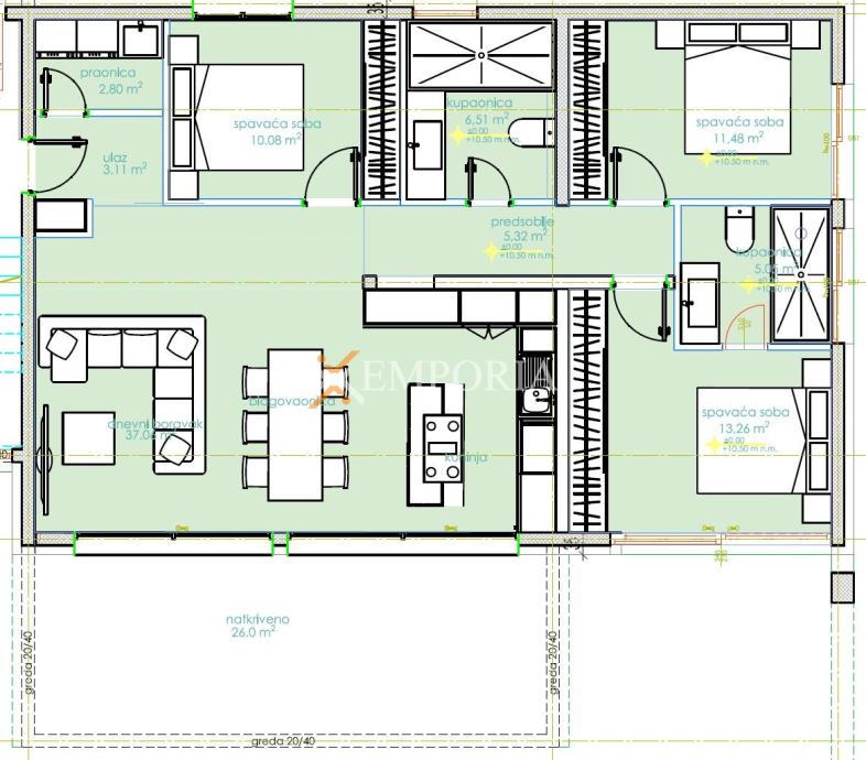 Raspored prostorija uključuje hodnik, dvije spavaće sobe, spavaću sobu s vlastitom kupaonicom, dodatnu kupaonicu, praonicu, kuhinju povezanu s blagovaonicom i dnevnim boravkom te natkrivenu terasu.